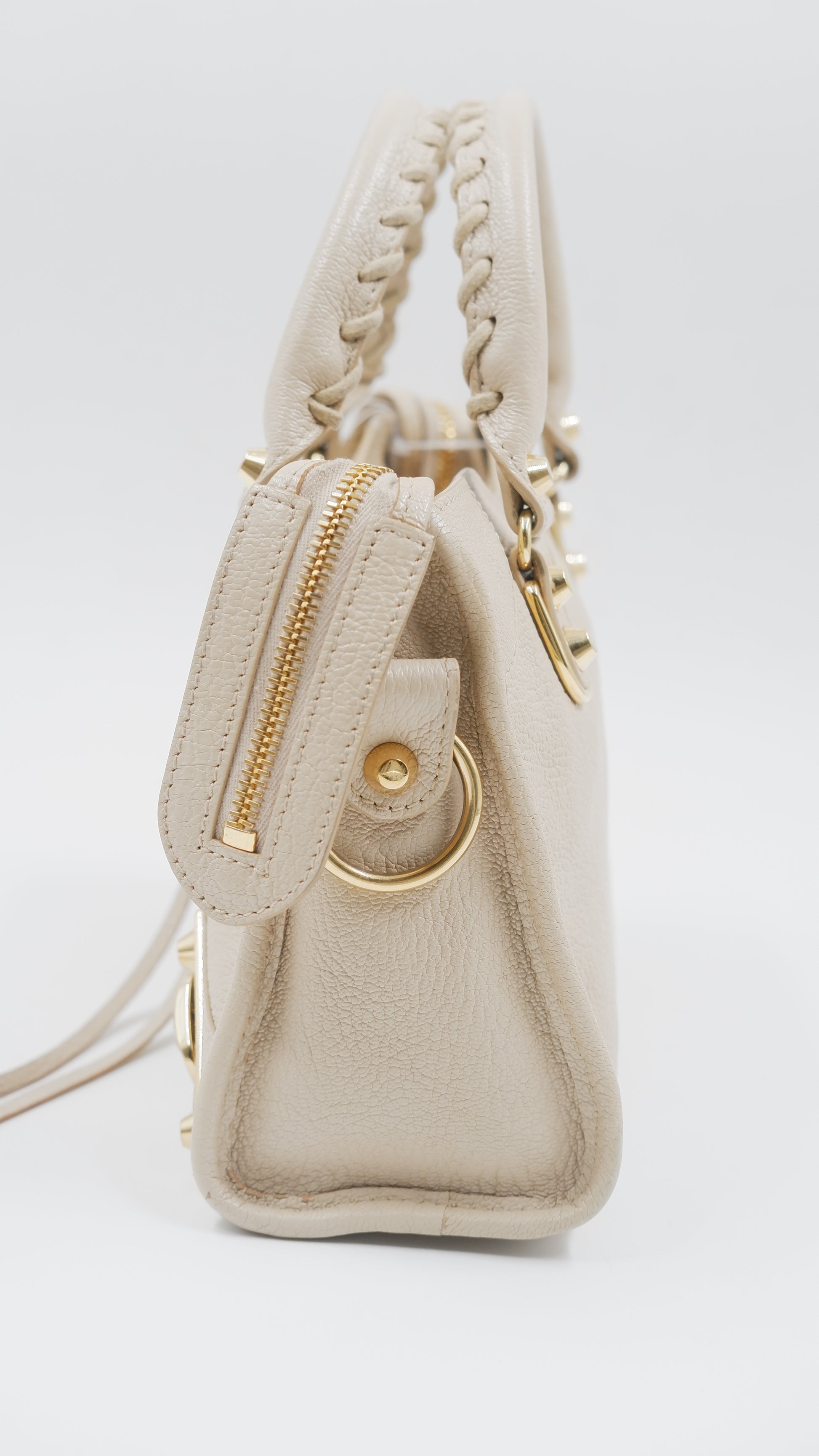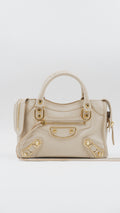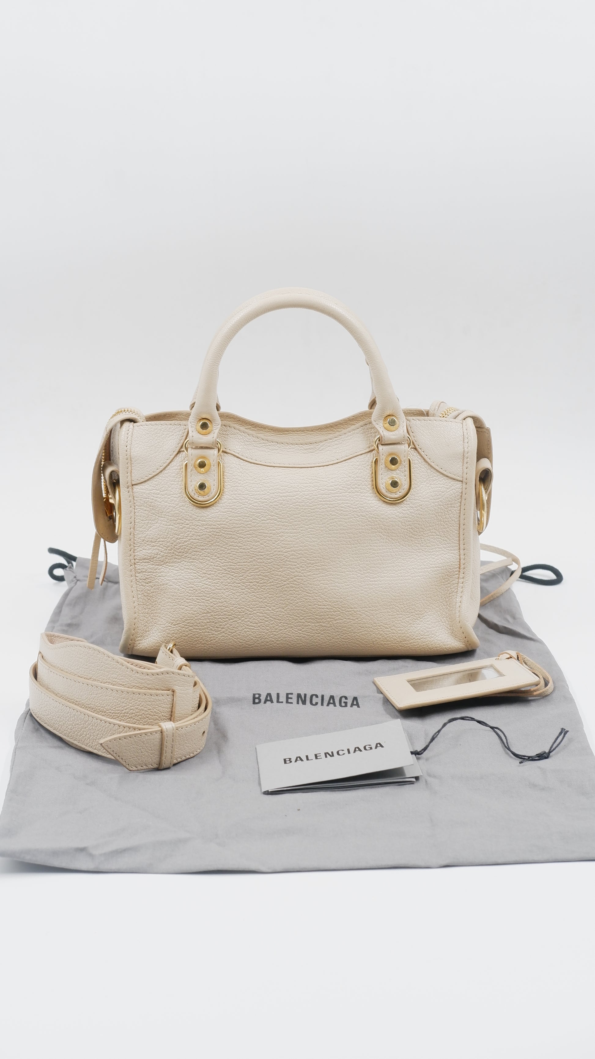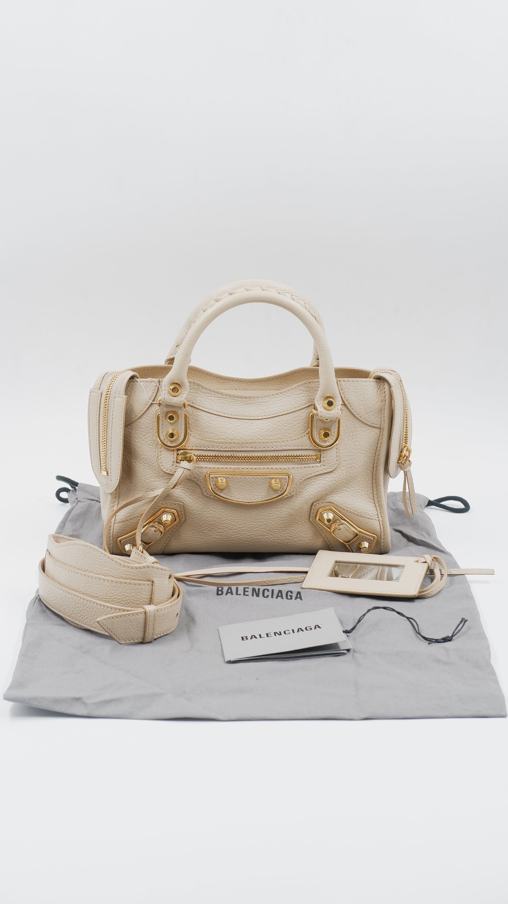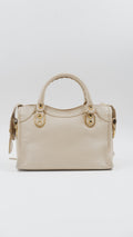 Experience elegance with the City Mini handbag, crafted from luxurious grained leather in a sophisticated beige hue. This pristine-condition accessory, made in Italy, boasts impeccable craftsmanship and a flawless exterior and interior, rated A+. Measuring a convenient L9.5 x W3 x H6.3 inches, it is both stylish and practical. Adorned with gleaming gold hardware (GHW), it includes essential accessories such as a mirror, a versatile strap, a bag organizer to keep your essentials neatly arranged, and the original dust bag for protection. Elevate your ensemble with this timeless, refined piece.