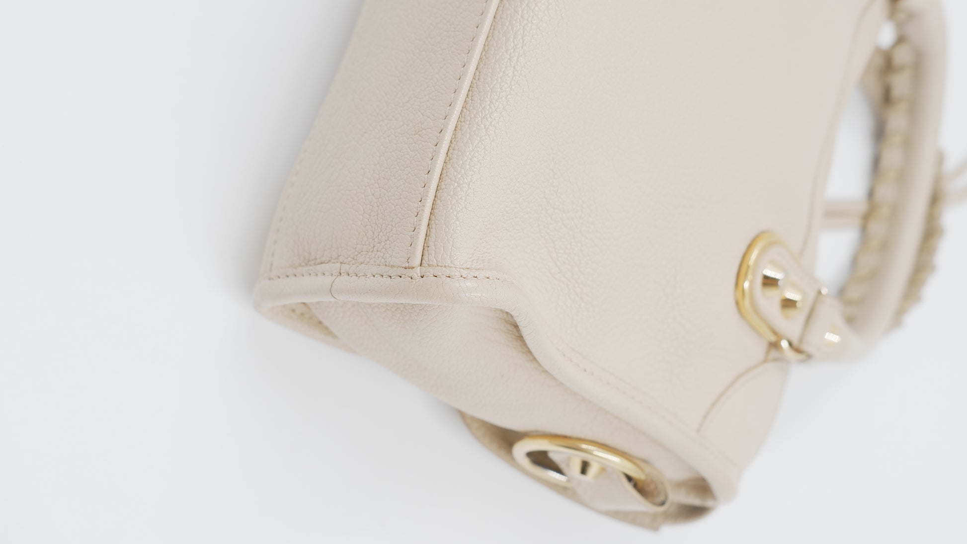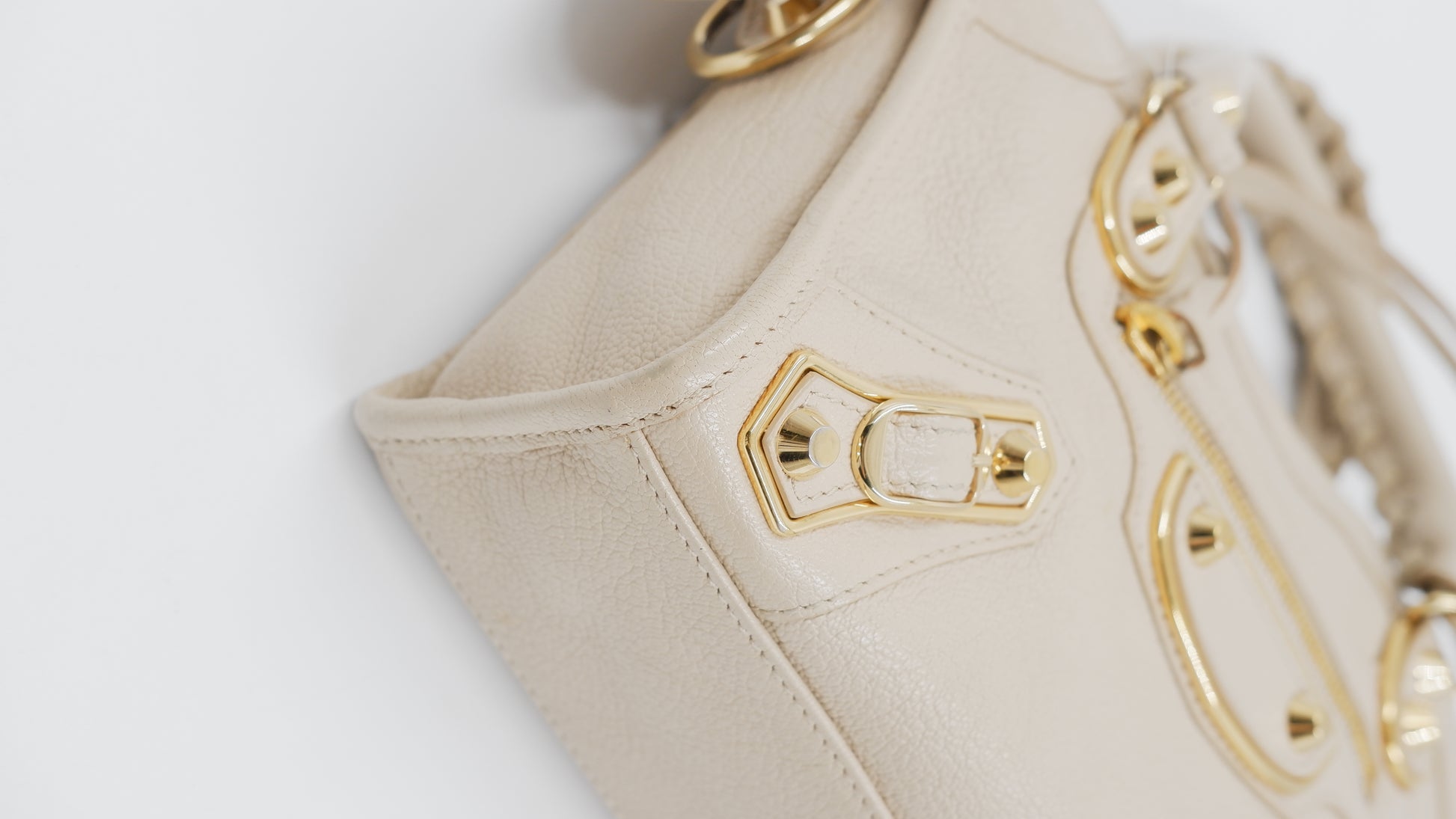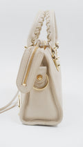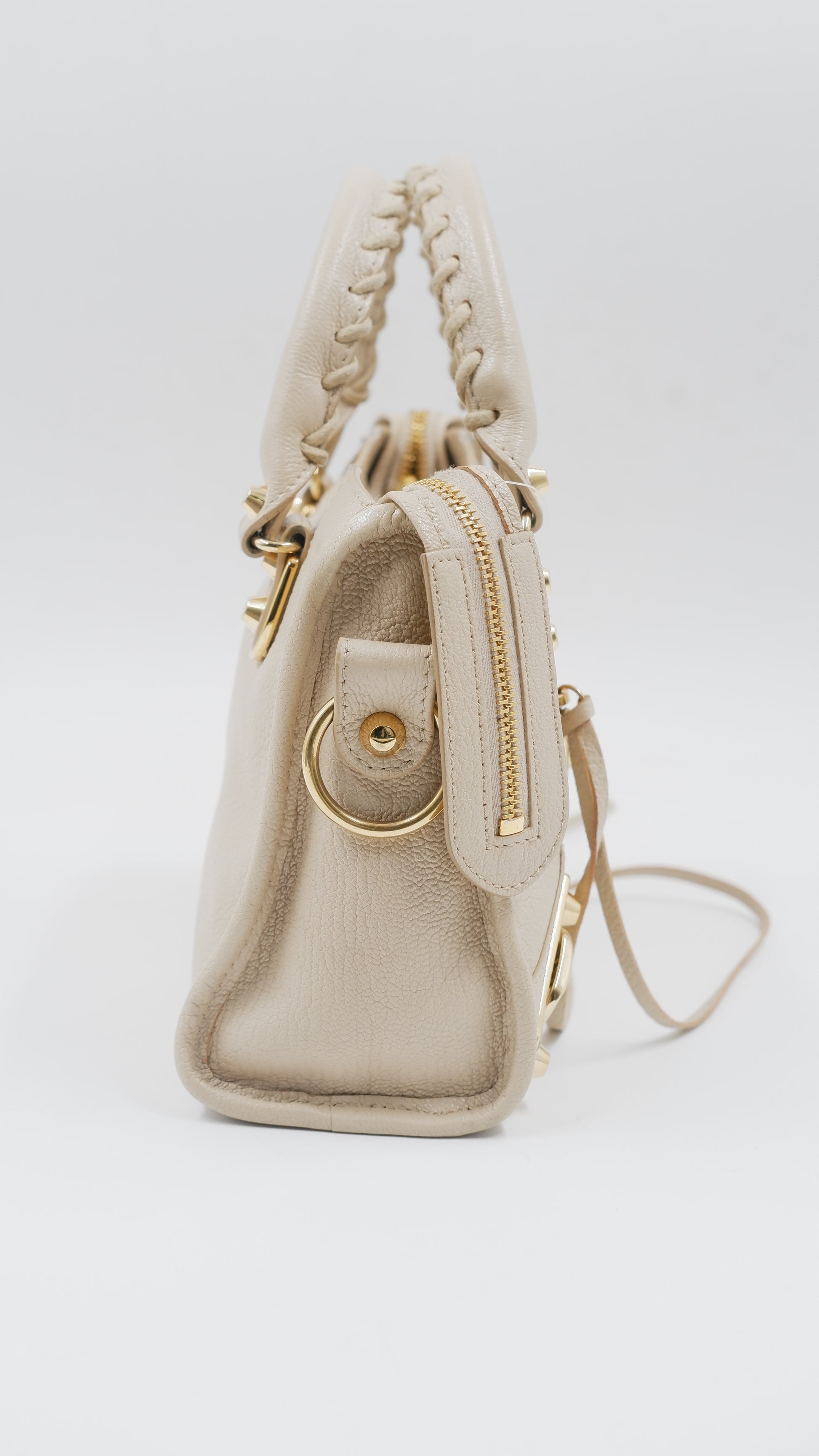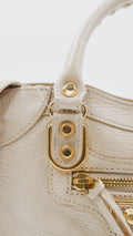 Experience elegance with the City Mini handbag, crafted from luxurious grained leather in a sophisticated beige hue. This pristine-condition accessory, made in Italy, boasts impeccable craftsmanship and a flawless exterior and interior, rated A+. Measuring a convenient L9.5 x W3 x H6.3 inches, it is both stylish and practical. Adorned with gleaming gold hardware (GHW), it includes essential accessories such as a mirror, a versatile strap, a bag organizer to keep your essentials neatly arranged, and the original dust bag for protection. Elevate your ensemble with this timeless, refined piece.