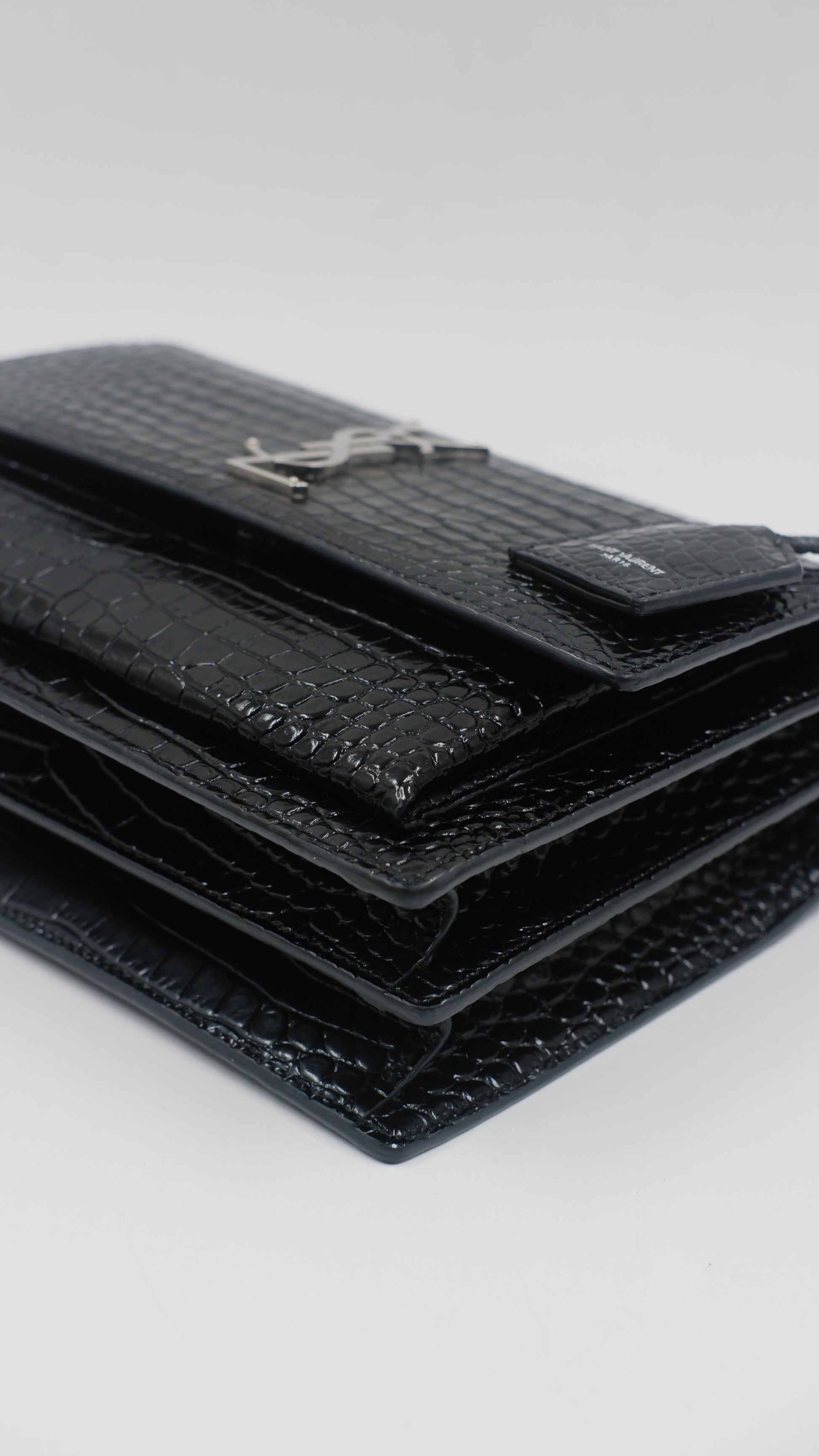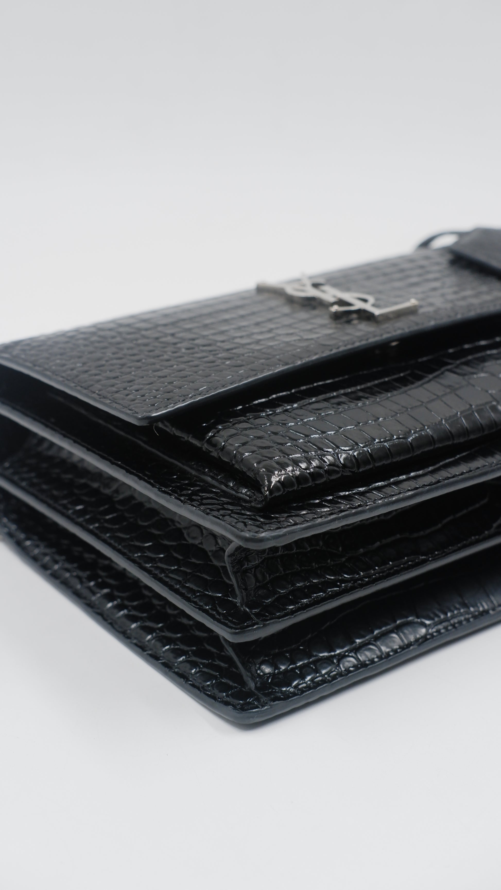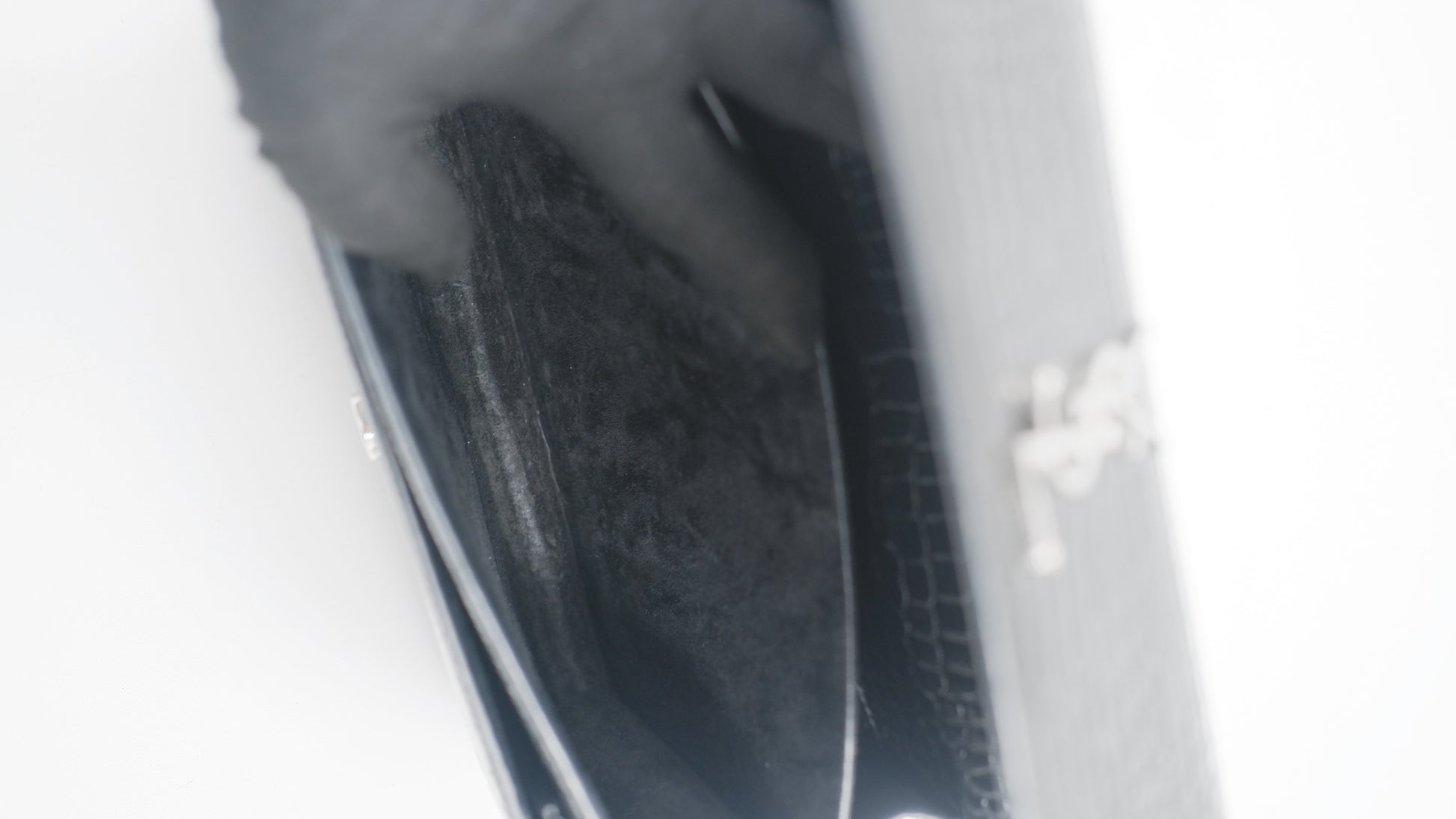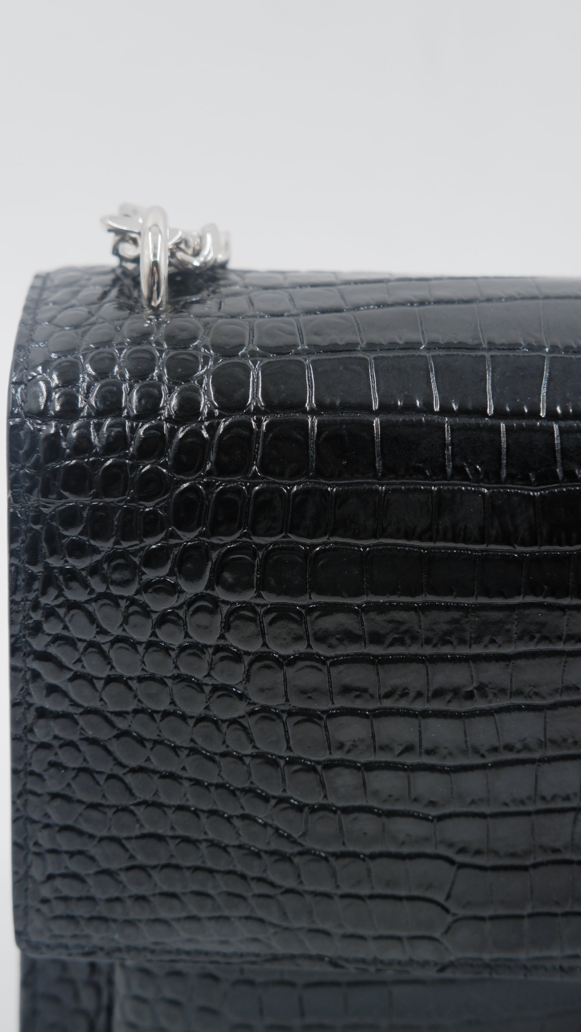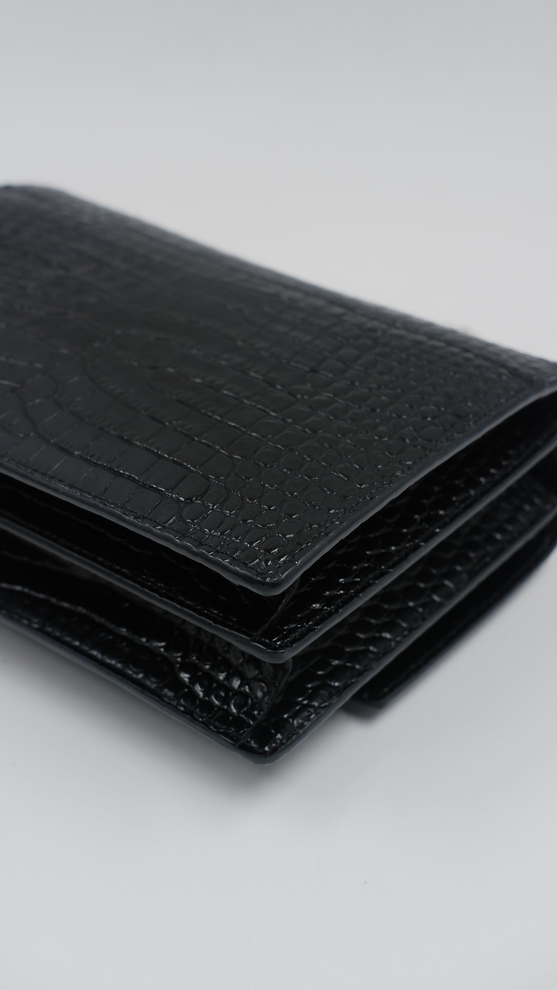 The Croc Sunset is a stunning blend of classic craftsmanship and modern luxury, made from fine calf leather with a distinctive crocodile texture that elevates its sophisticated appeal. Crafted in Italy, it maintains a like-new condition throughout, including the exterior and interior, ensuring a pristine and elegant look. Measuring L8.8 x W2.5 x H6, this piece is perfectly sized to hold your essentials with grace. Accented with refined silver hardware, it exudes timeless style. Included are the original cards and dust bag, providing both authenticity and protection. Ideal for those who value exquisite detail and enduring quality.