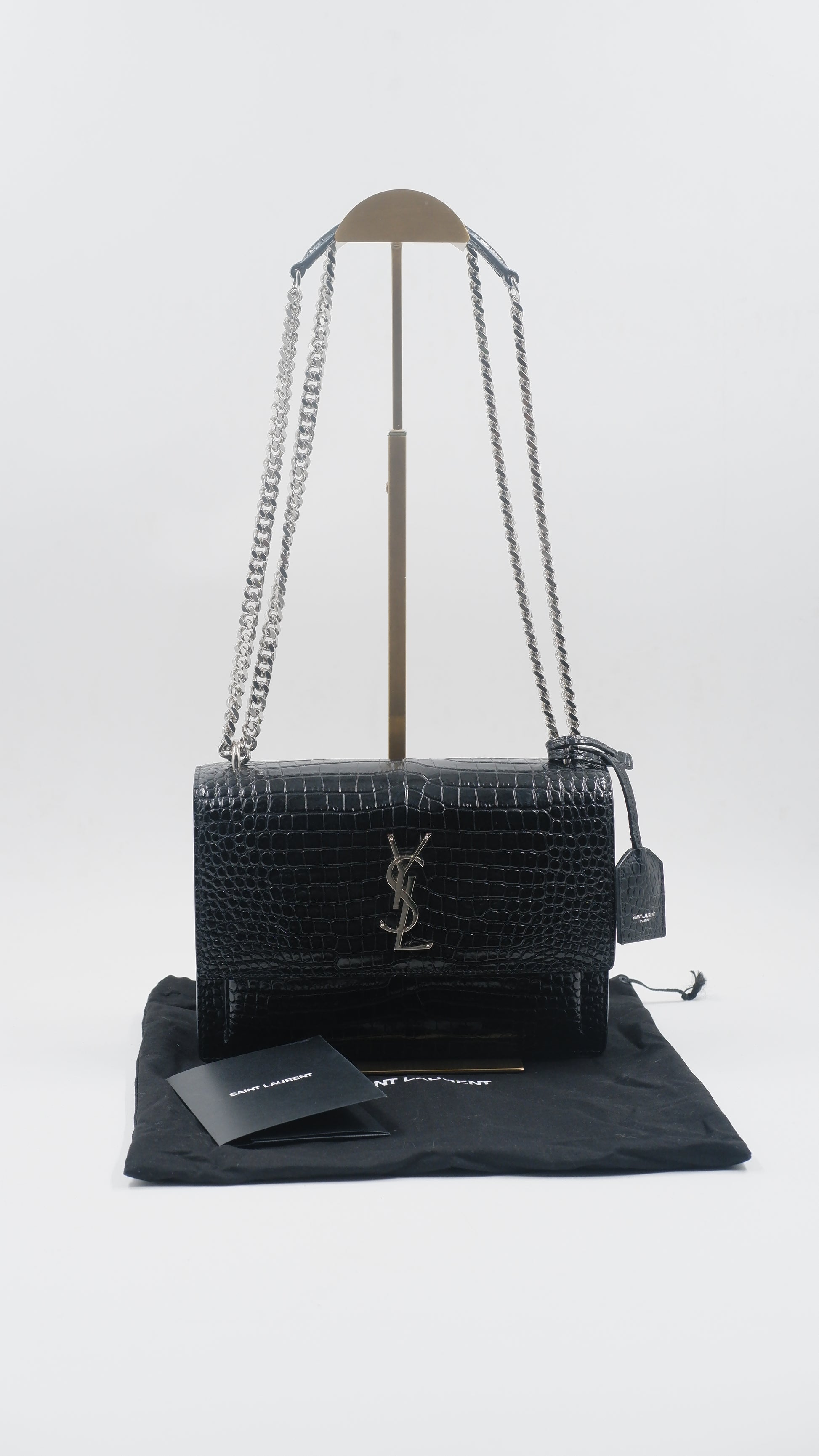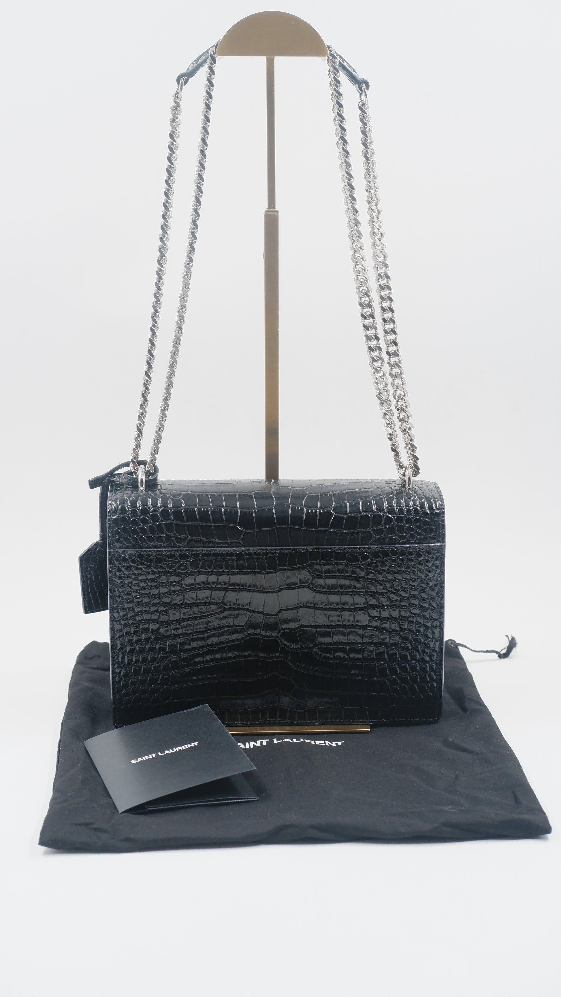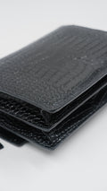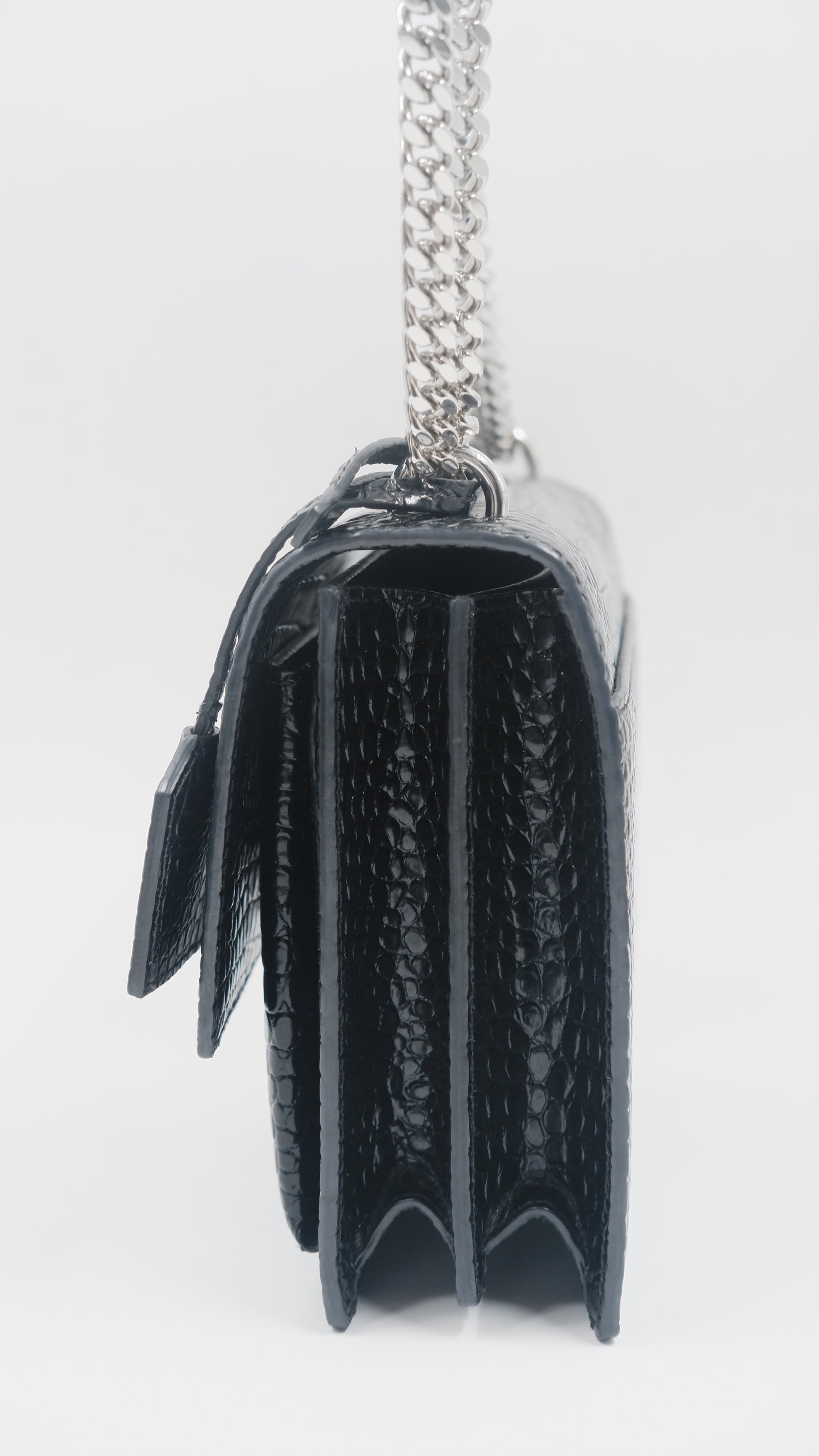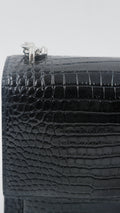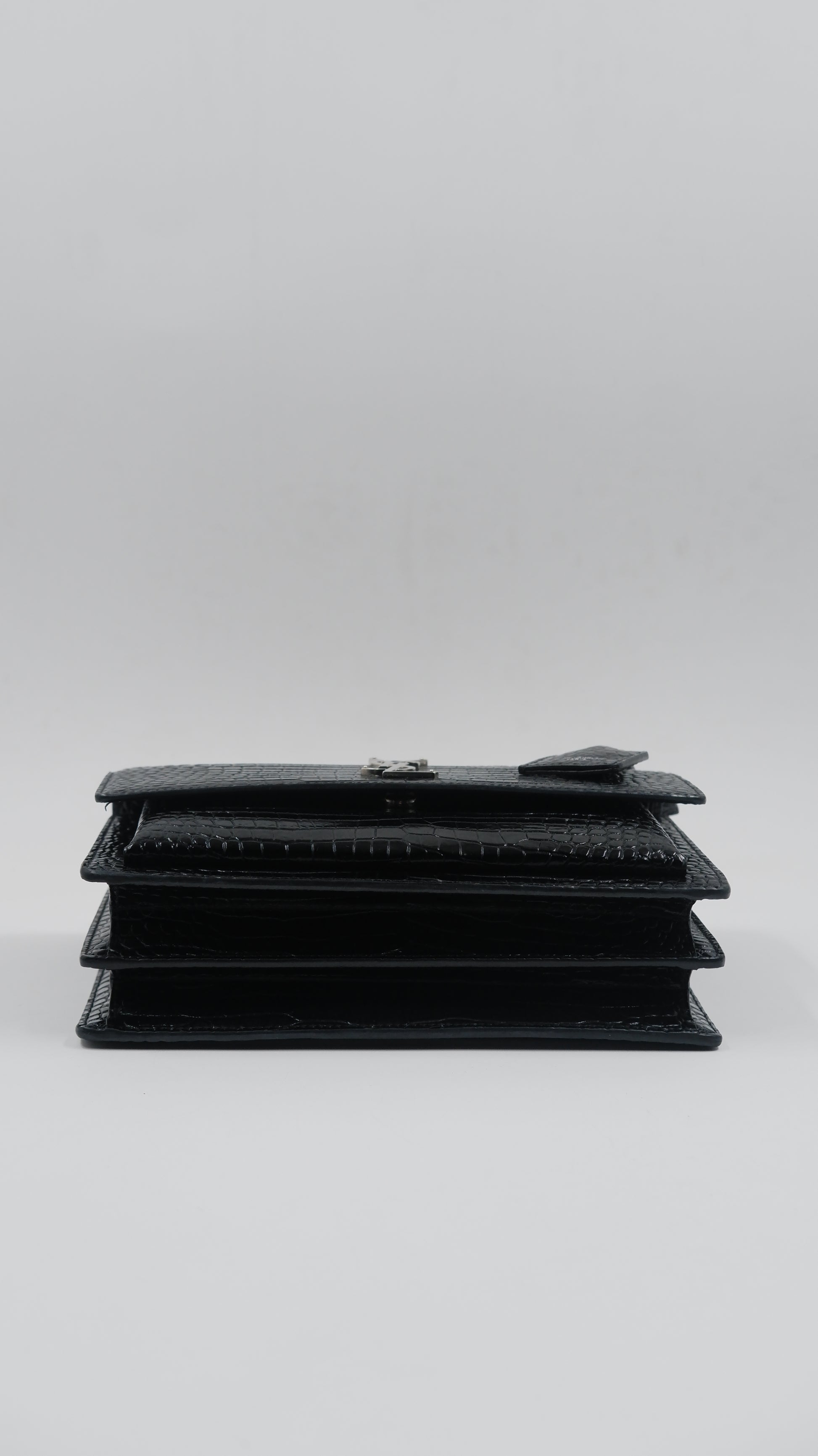 The Croc Sunset is a stunning blend of classic craftsmanship and modern luxury, made from fine calf leather with a distinctive crocodile texture that elevates its sophisticated appeal. Crafted in Italy, it maintains a like-new condition throughout, including the exterior and interior, ensuring a pristine and elegant look. Measuring L8.8 x W2.5 x H6, this piece is perfectly sized to hold your essentials with grace. Accented with refined silver hardware, it exudes timeless style. Included are the original cards and dust bag, providing both authenticity and protection. Ideal for those who value exquisite detail and enduring quality.