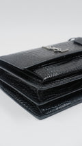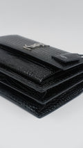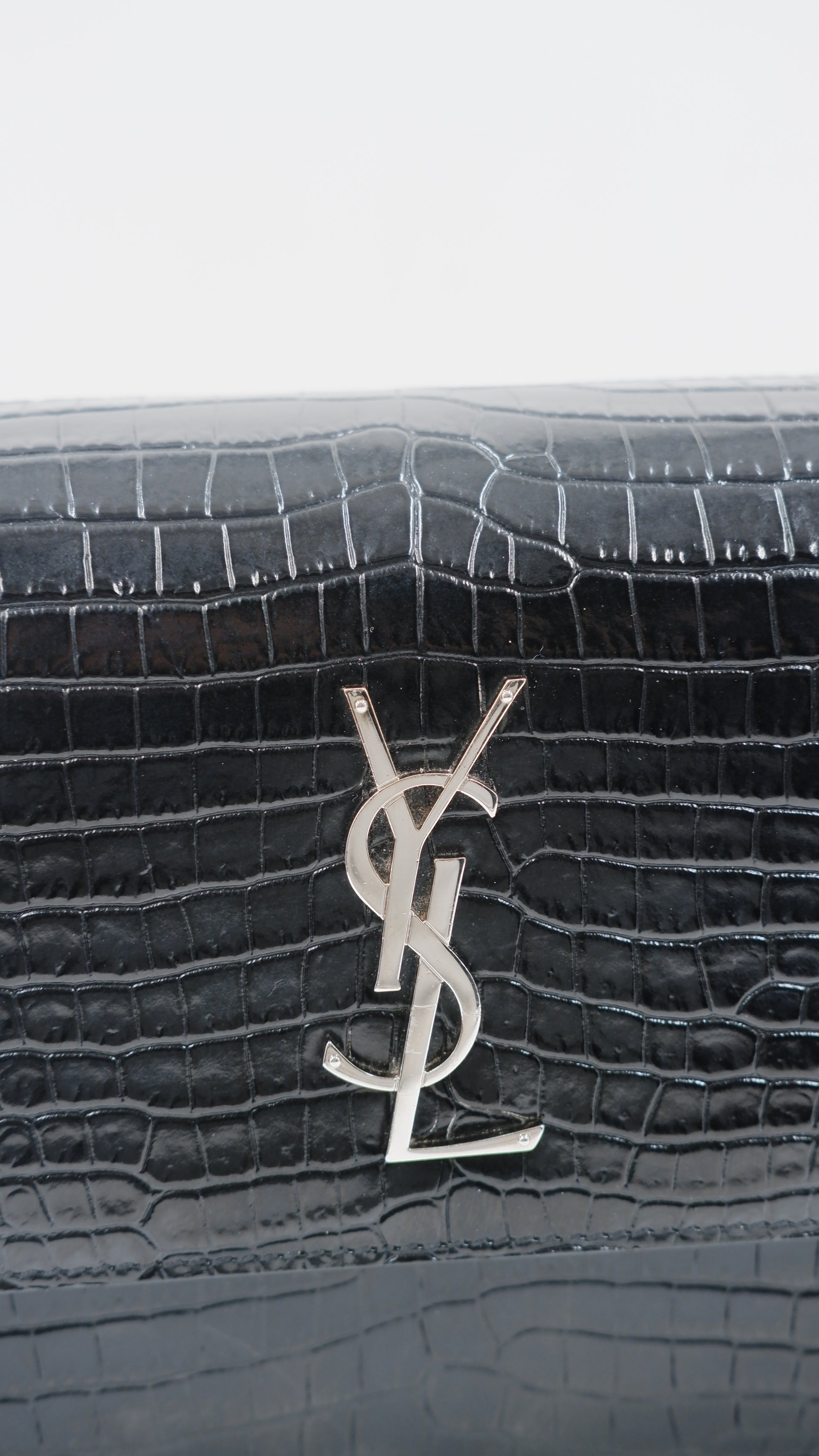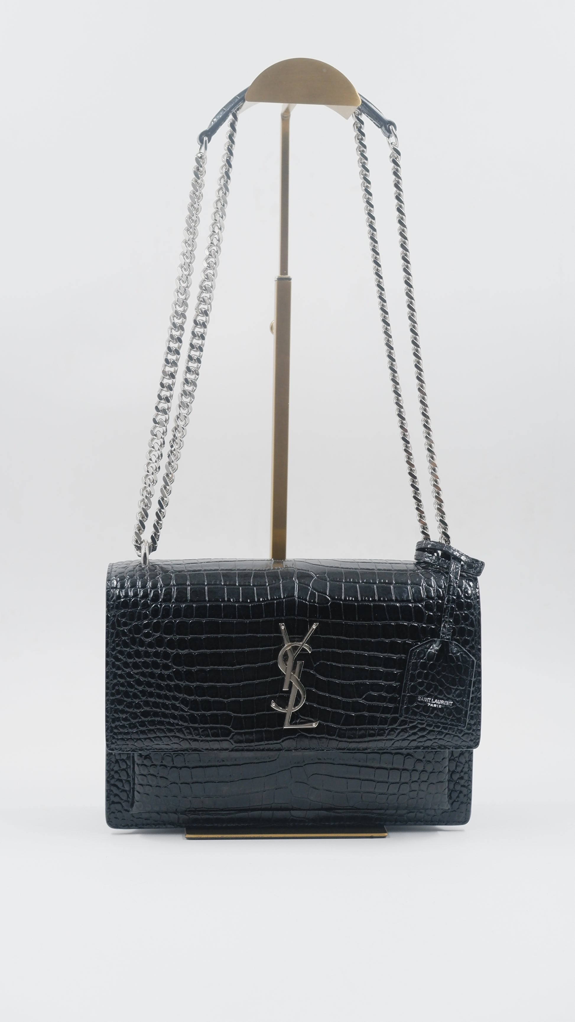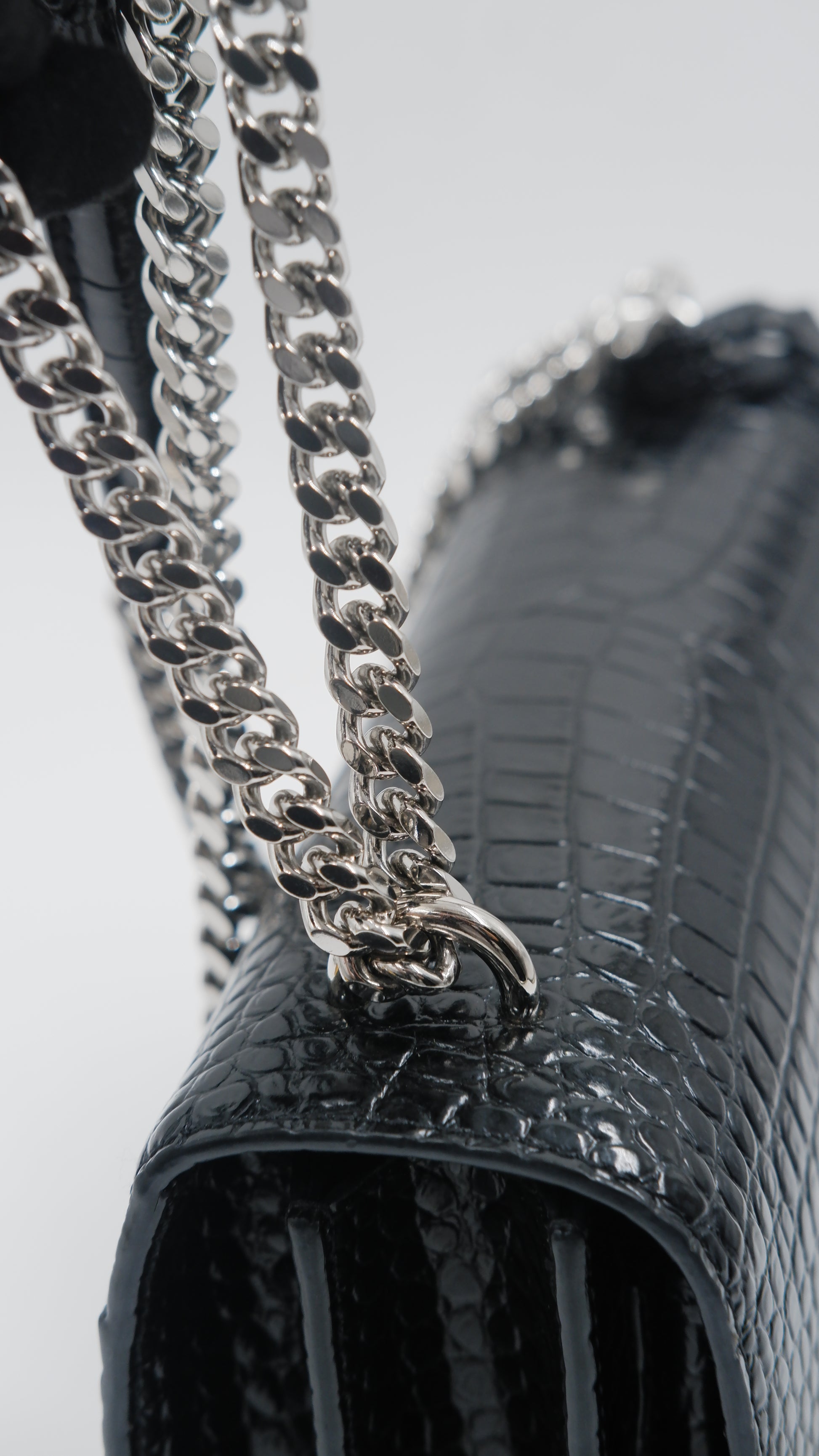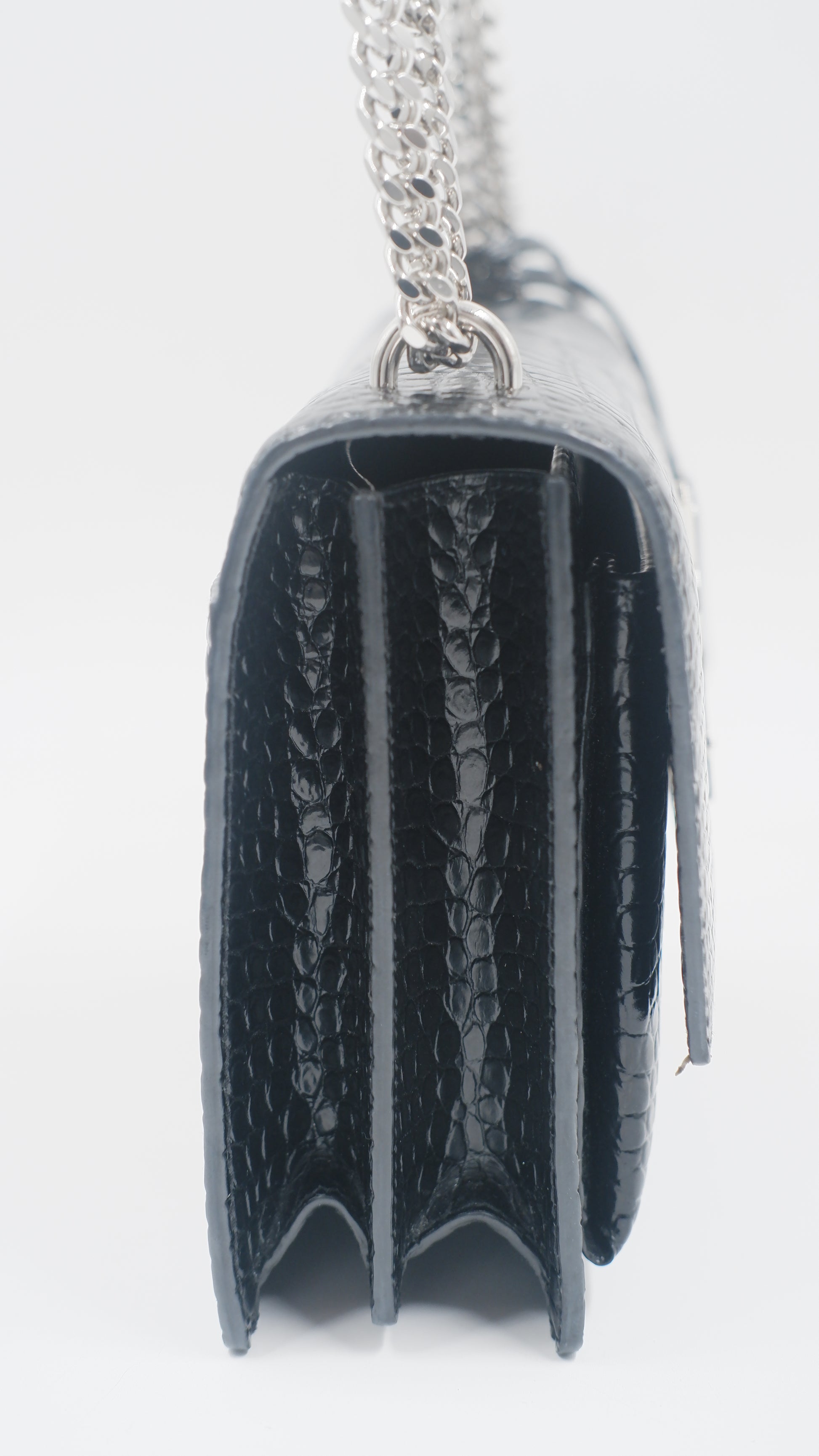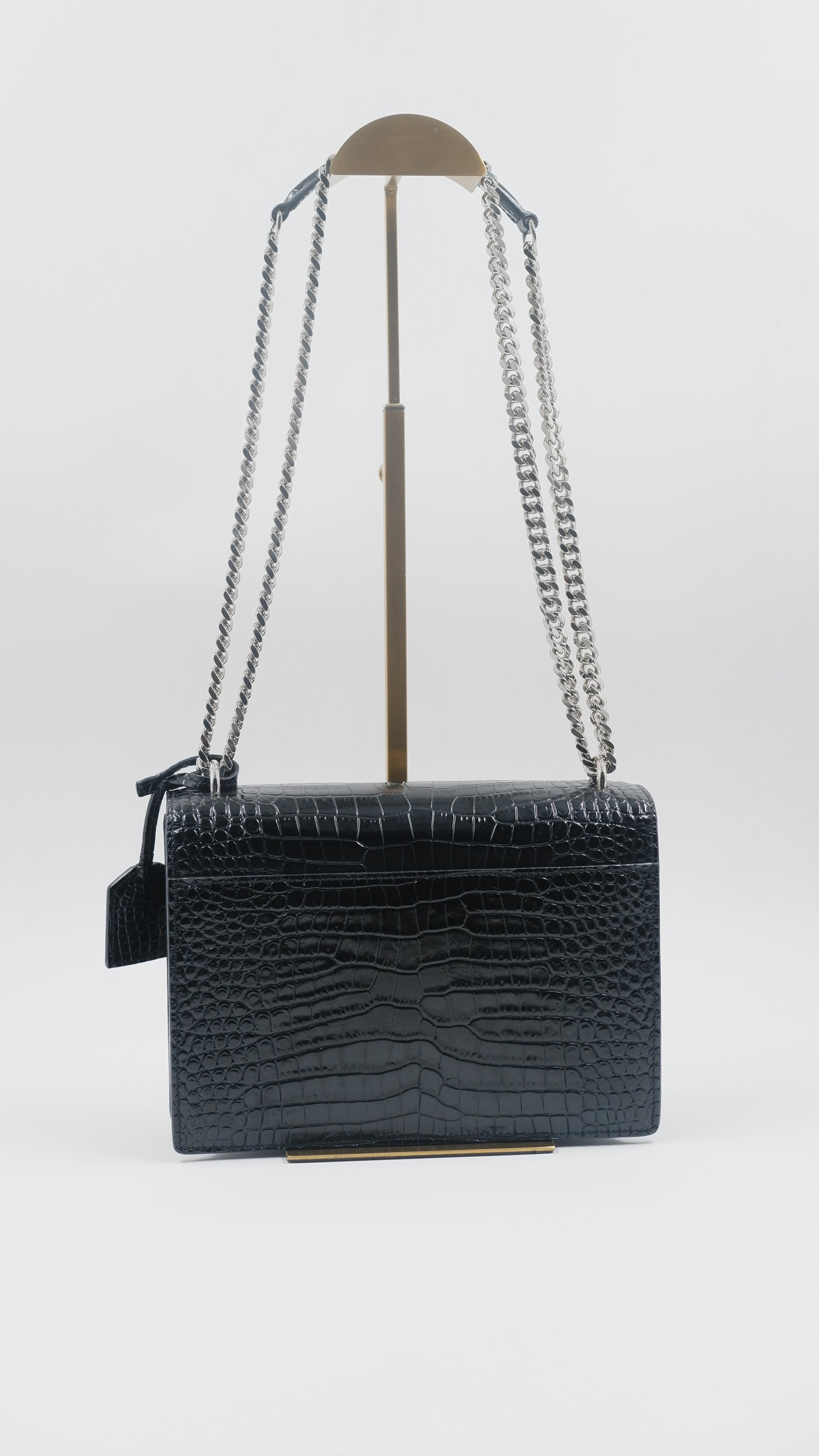 The Croc Sunset is a stunning blend of classic craftsmanship and modern luxury, made from fine calf leather with a distinctive crocodile texture that elevates its sophisticated appeal. Crafted in Italy, it maintains a like-new condition throughout, including the exterior and interior, ensuring a pristine and elegant look. Measuring L8.8 x W2.5 x H6, this piece is perfectly sized to hold your essentials with grace. Accented with refined silver hardware, it exudes timeless style. Included are the original cards and dust bag, providing both authenticity and protection. Ideal for those who value exquisite detail and enduring quality.