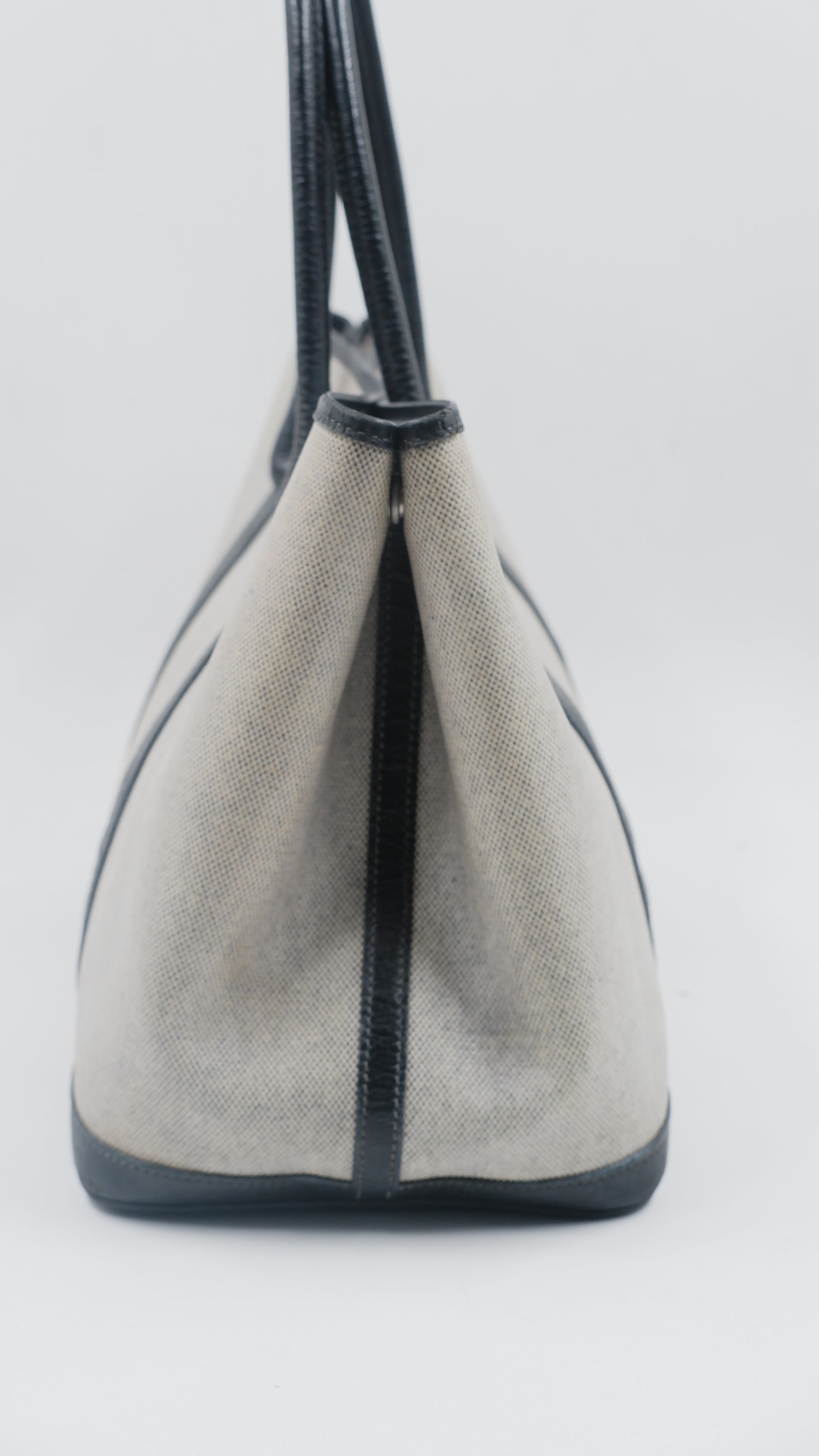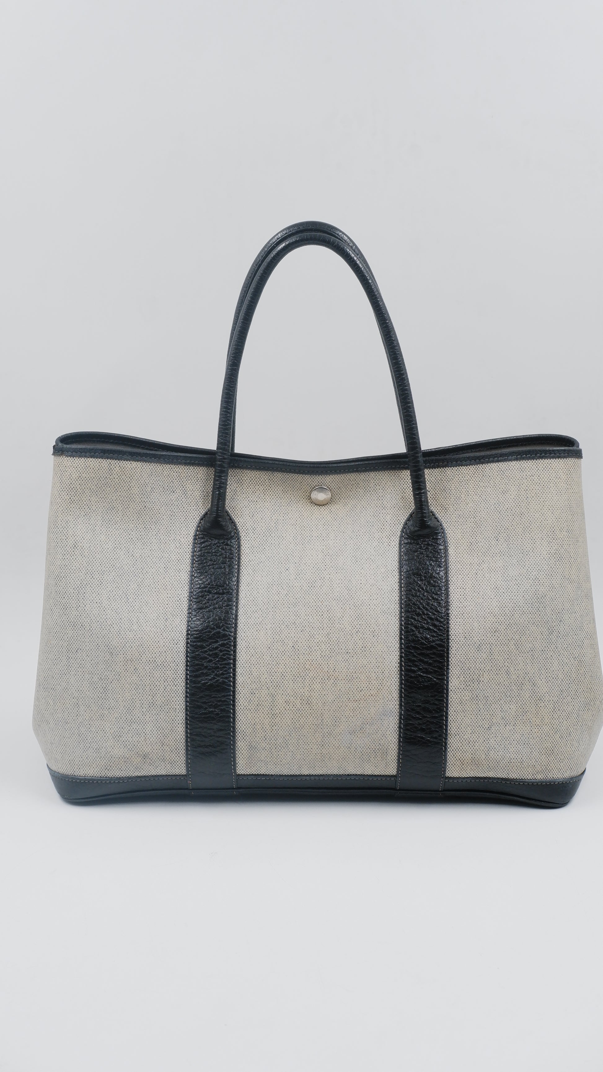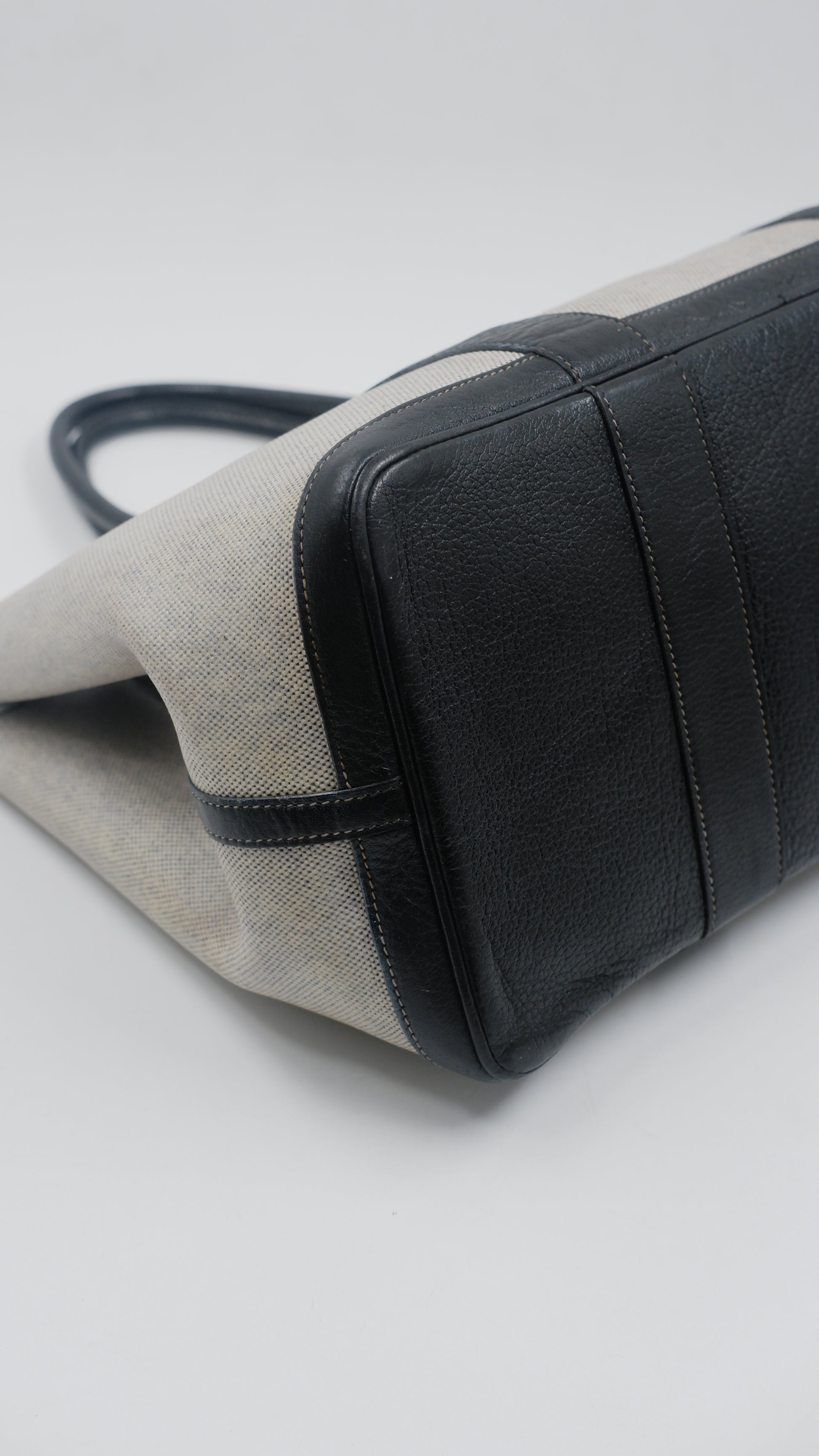 The Garden Party Tote Bag exudes timeless elegance with its refined beige canvas exterior and silver-tone hardware, crafted meticulously in France. Its spacious dimensions (L14 x W7 x H9.5 inches) offer practicality without compromising style, making it perfect for both casual outings and sophisticated occasions. The bag’s exterior is in excellent condition, showcasing a pristine look, while the interior remains very good, ensuring durability and functionality. Accompanied by its original dust bag, this tote maintains its graceful presence and superior craftsmanship, embodying sophistication for the discerning individual.