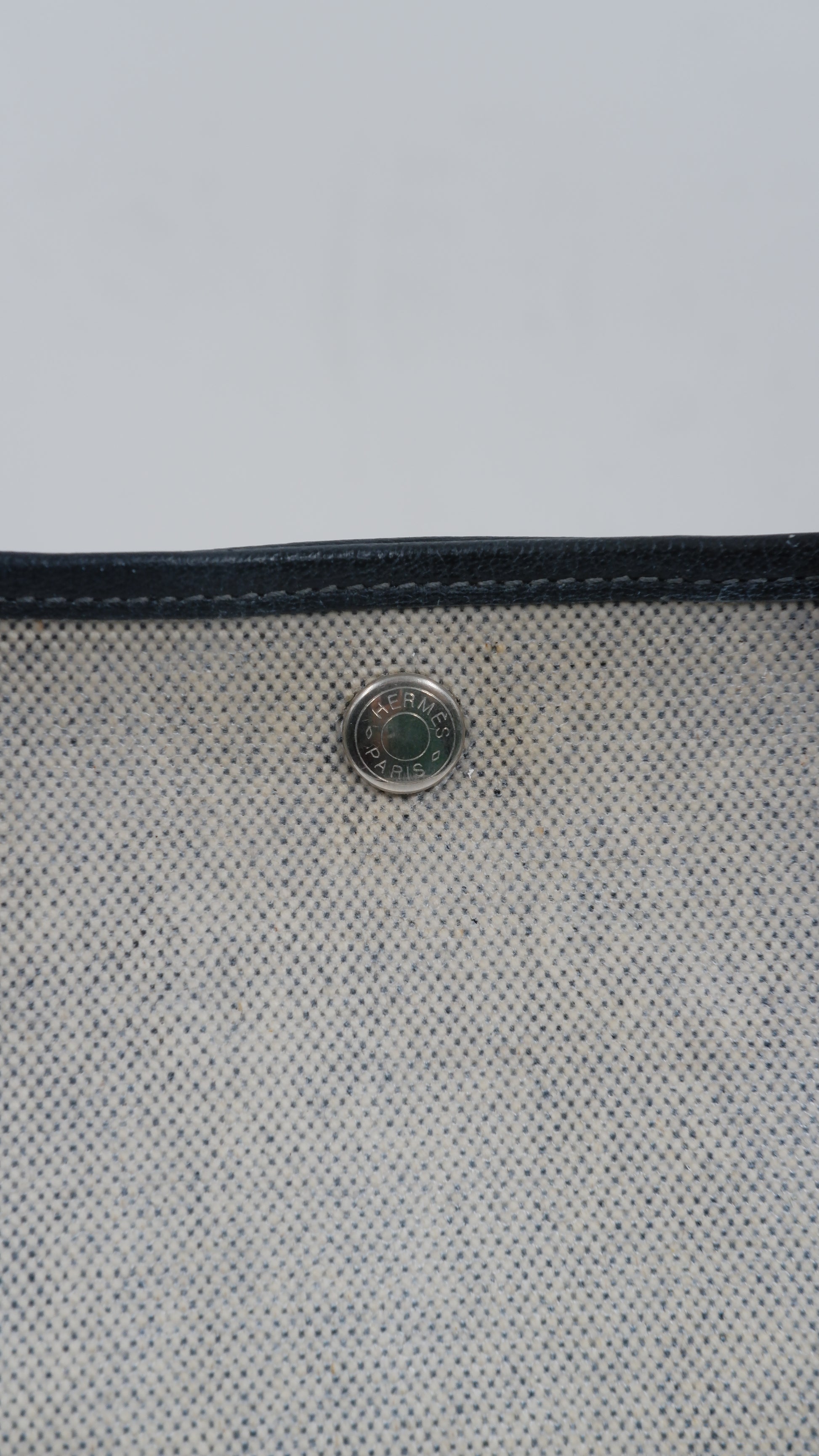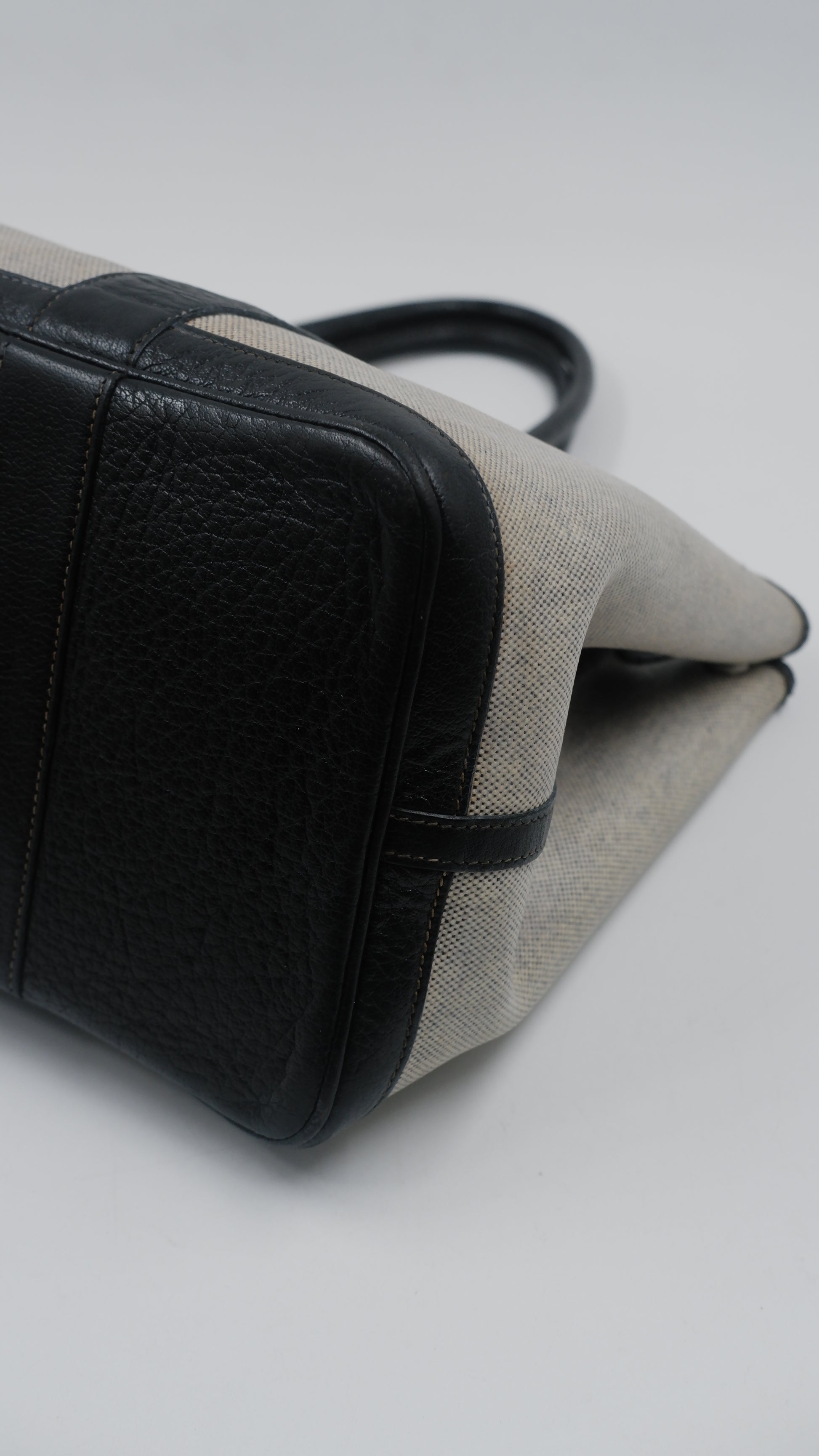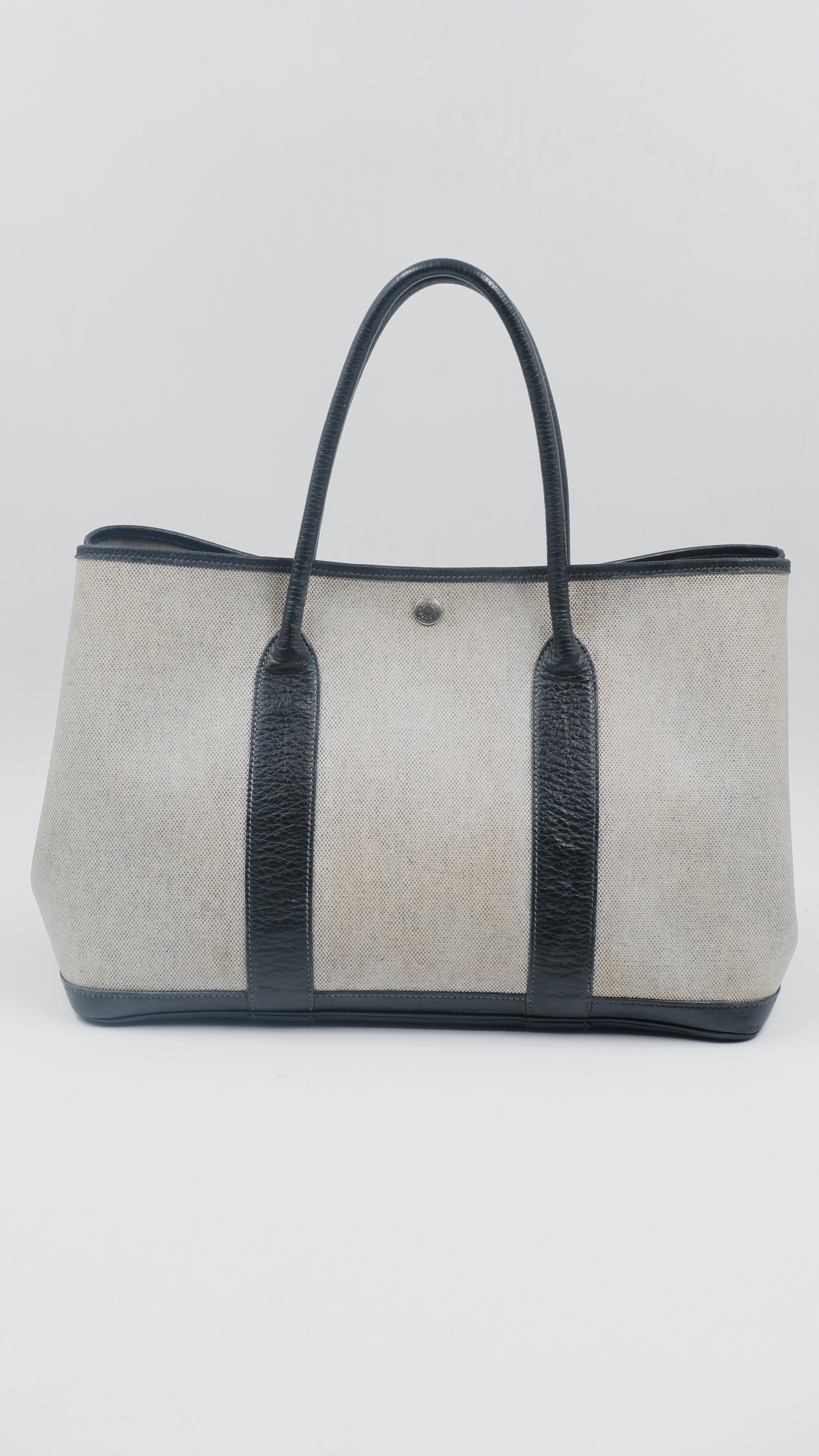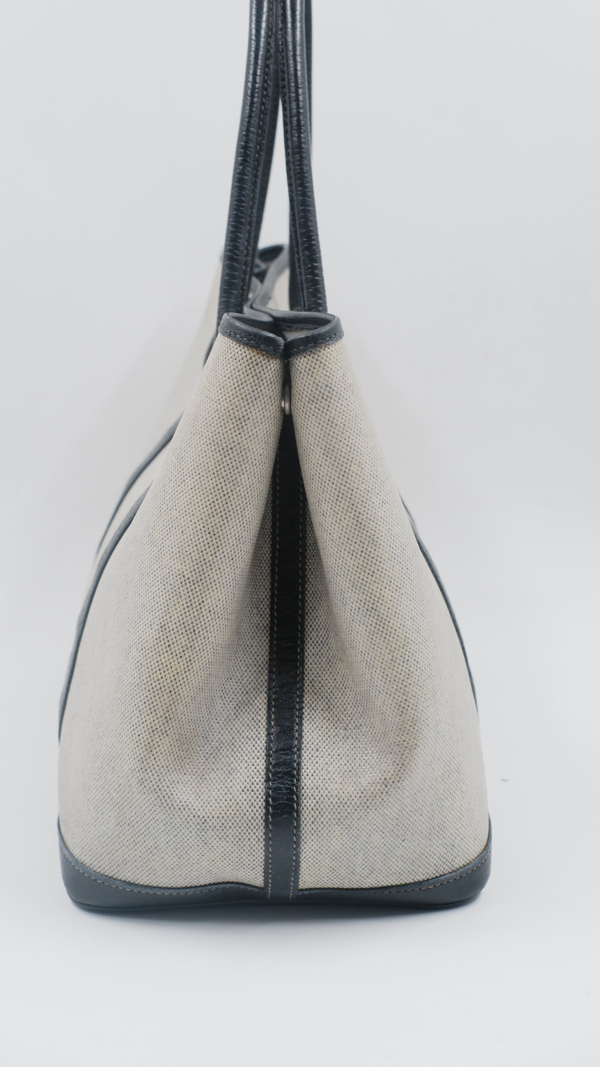 The Garden Party Tote Bag exudes timeless elegance with its refined beige canvas exterior and silver-tone hardware, crafted meticulously in France. Its spacious dimensions (L14 x W7 x H9.5 inches) offer practicality without compromising style, making it perfect for both casual outings and sophisticated occasions. The bag’s exterior is in excellent condition, showcasing a pristine look, while the interior remains very good, ensuring durability and functionality. Accompanied by its original dust bag, this tote maintains its graceful presence and superior craftsmanship, embodying sophistication for the discerning individual.