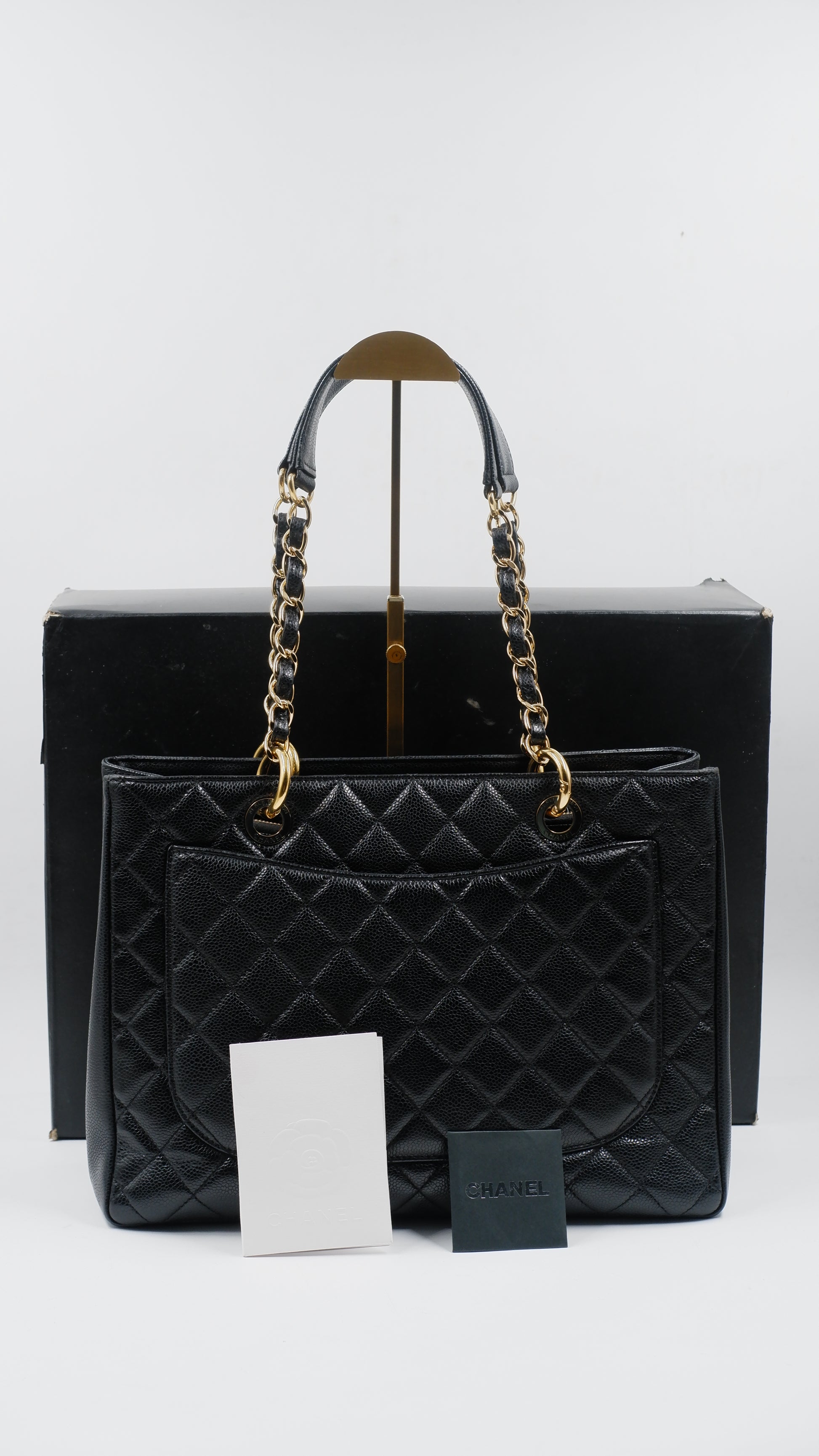 The GST Black Series 19 is crafted from luxurious caviar leather, showcasing exceptional durability and a refined texture. Made in Italy, this piece exemplifies impeccable craftsmanship and timeless elegance. It boasts a sleek black exterior complemented by gleaming gold hardware, creating a sophisticated and versatile accessory for any occasion. The spacious interior, also in mint condition, offers ample room for essentials while maintaining a compact silhouette with measurements of L13.9 x W5.2 x H9.8 cm. This exquisite handbag comes complete with its original card, dust bag, and box, ensuring both authenticity and protection. Ranked A+ for its pristine condition, it promises a perfect blend of style and enduring quality.
