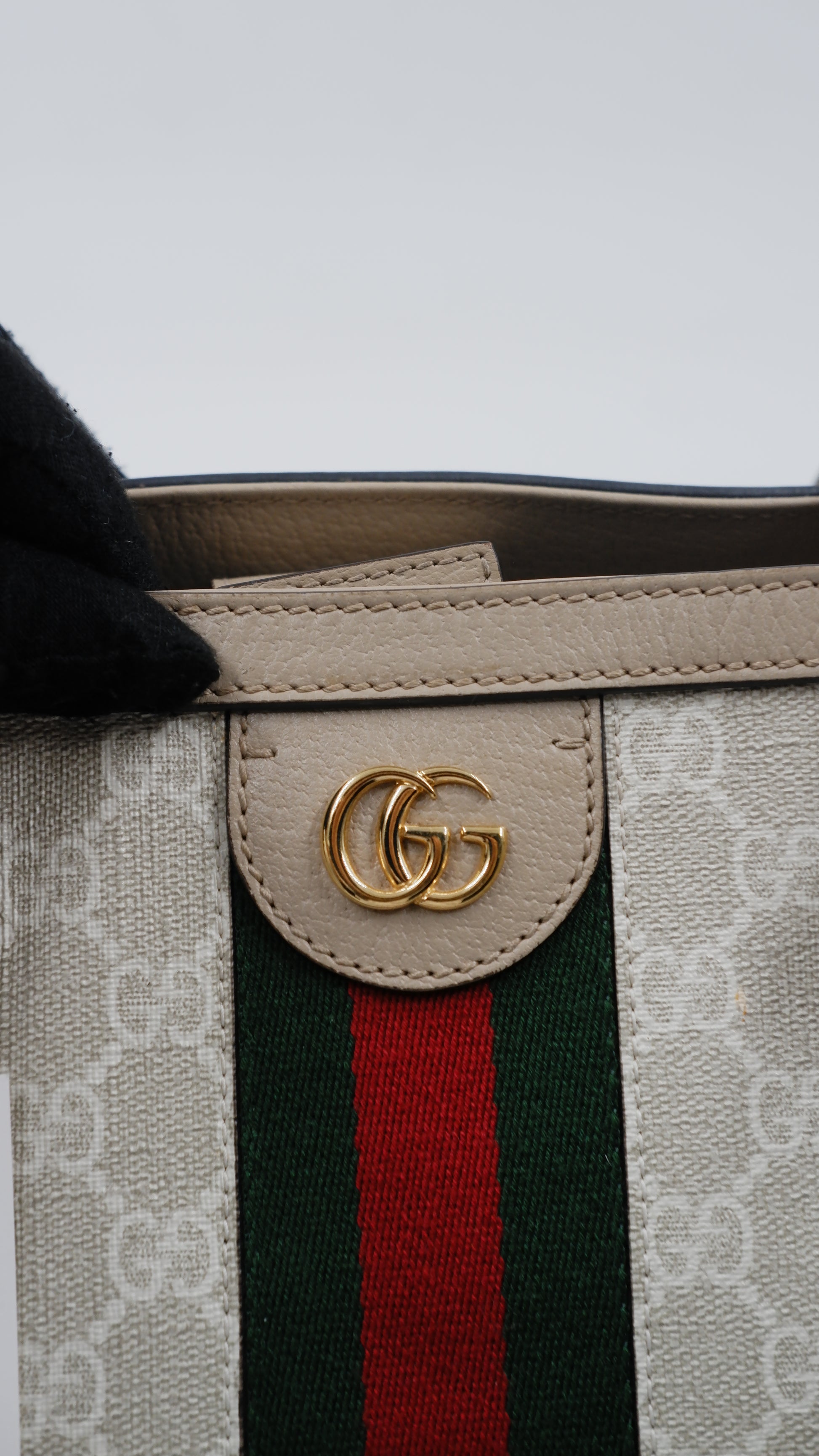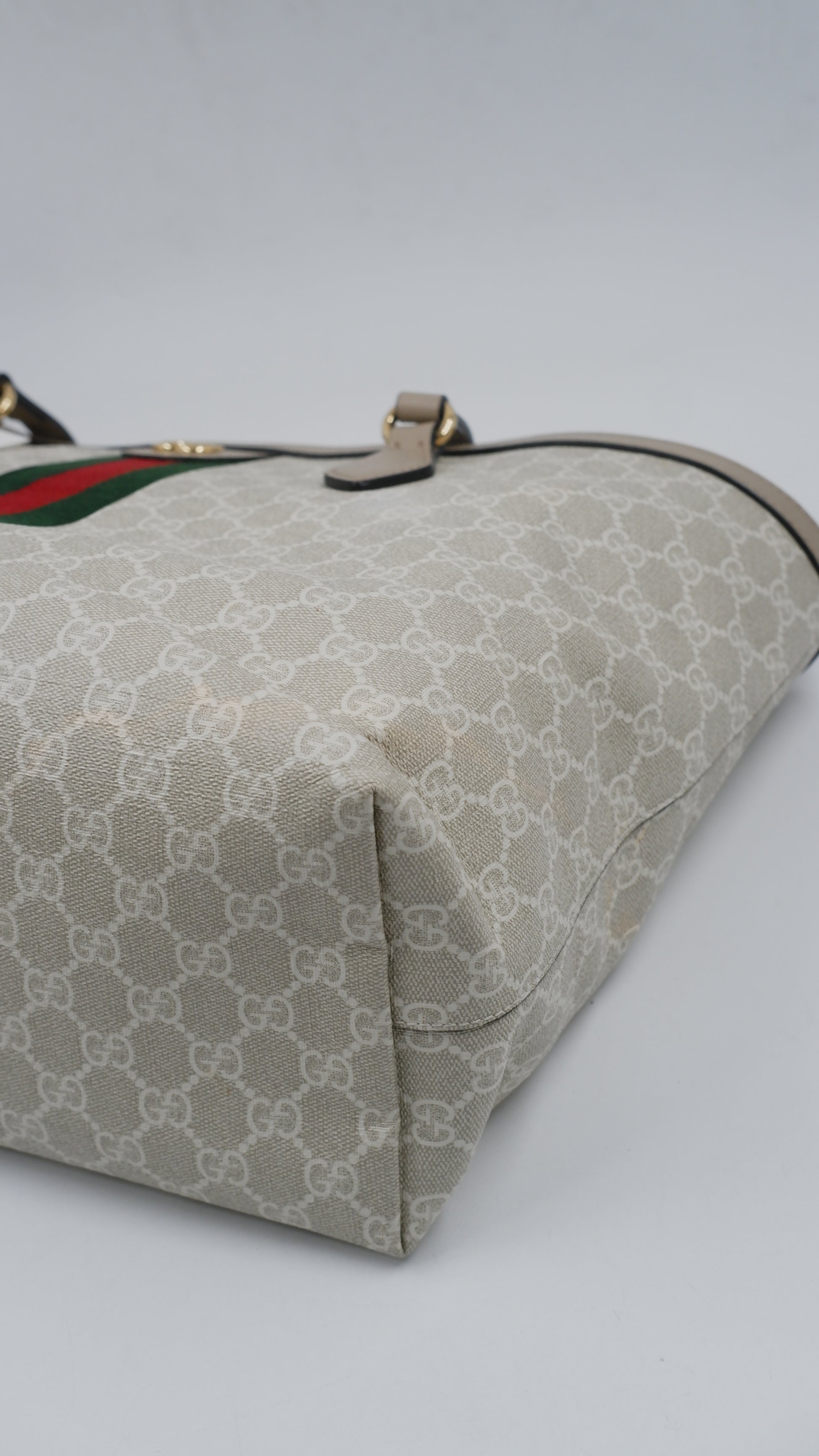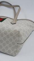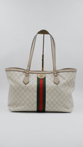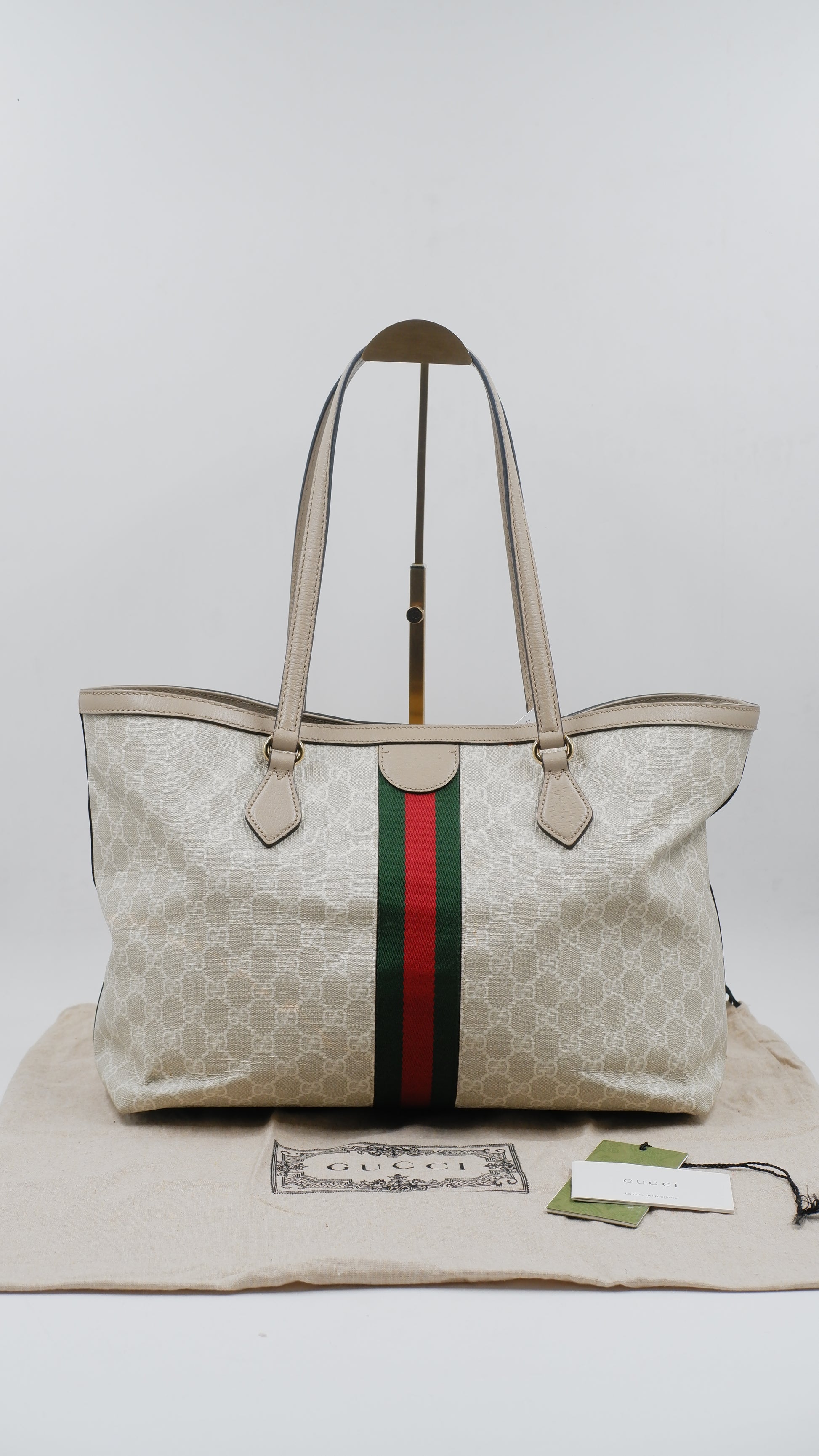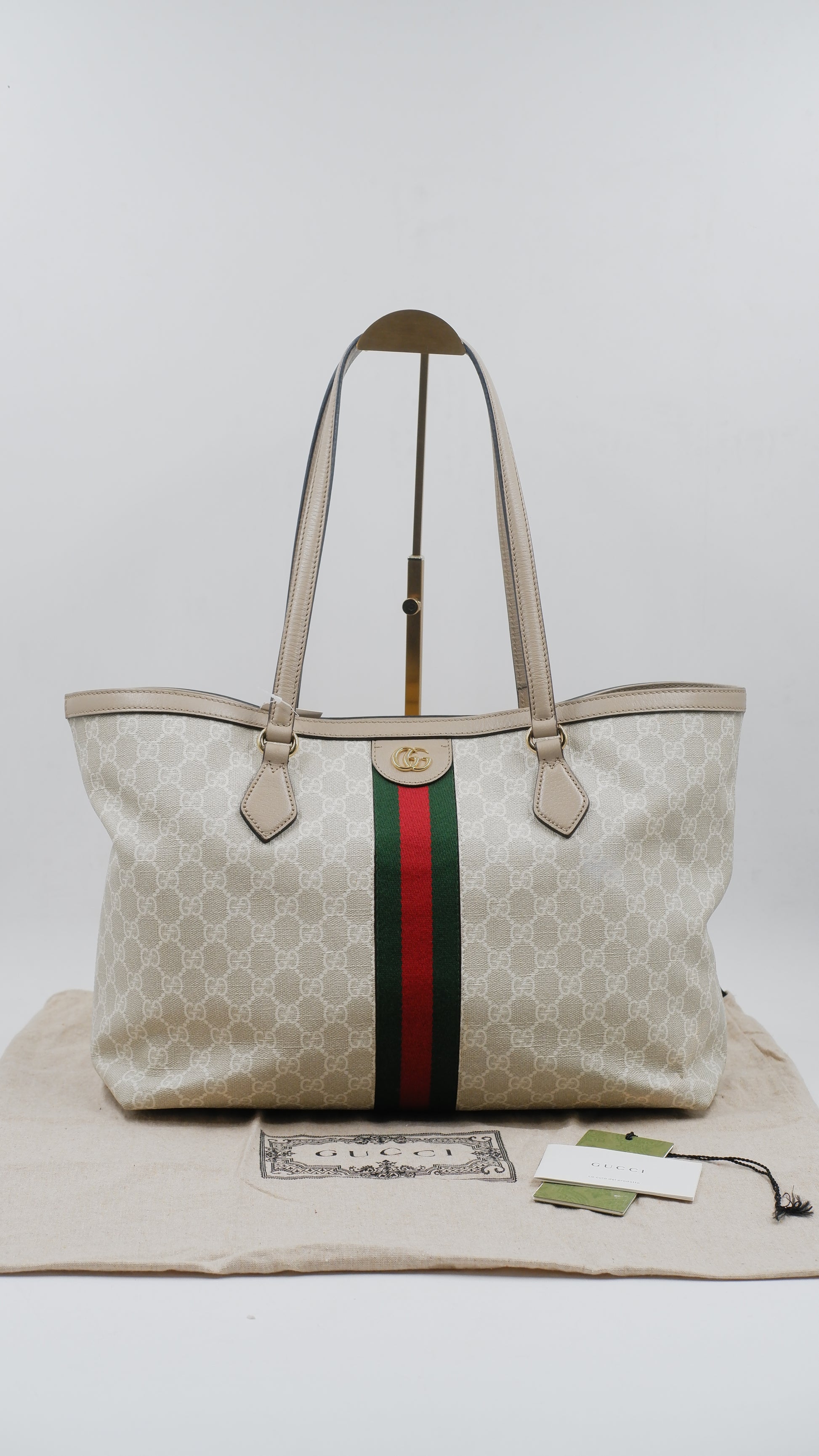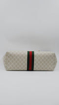 The Ophidia Tote Bag exemplifies refined elegance with its impeccable condition, showcasing excellent quality both on the exterior and interior. Crafted in Italy from durable coated canvas, this sophisticated beige tote pairs timeless style with practical functionality. Its dimensions (L14 x W6 x H10.5 inches) offer ample space for essentials while maintaining a sleek silhouette. Accented with exquisite gold hardware, the bag reflects superior craftsmanship. Included is the original dust bag, ensuring the protection and preservation of this luxurious accessory. Perfect for elevating your everyday ensemble with a touch of classic Italian luxury.