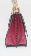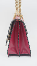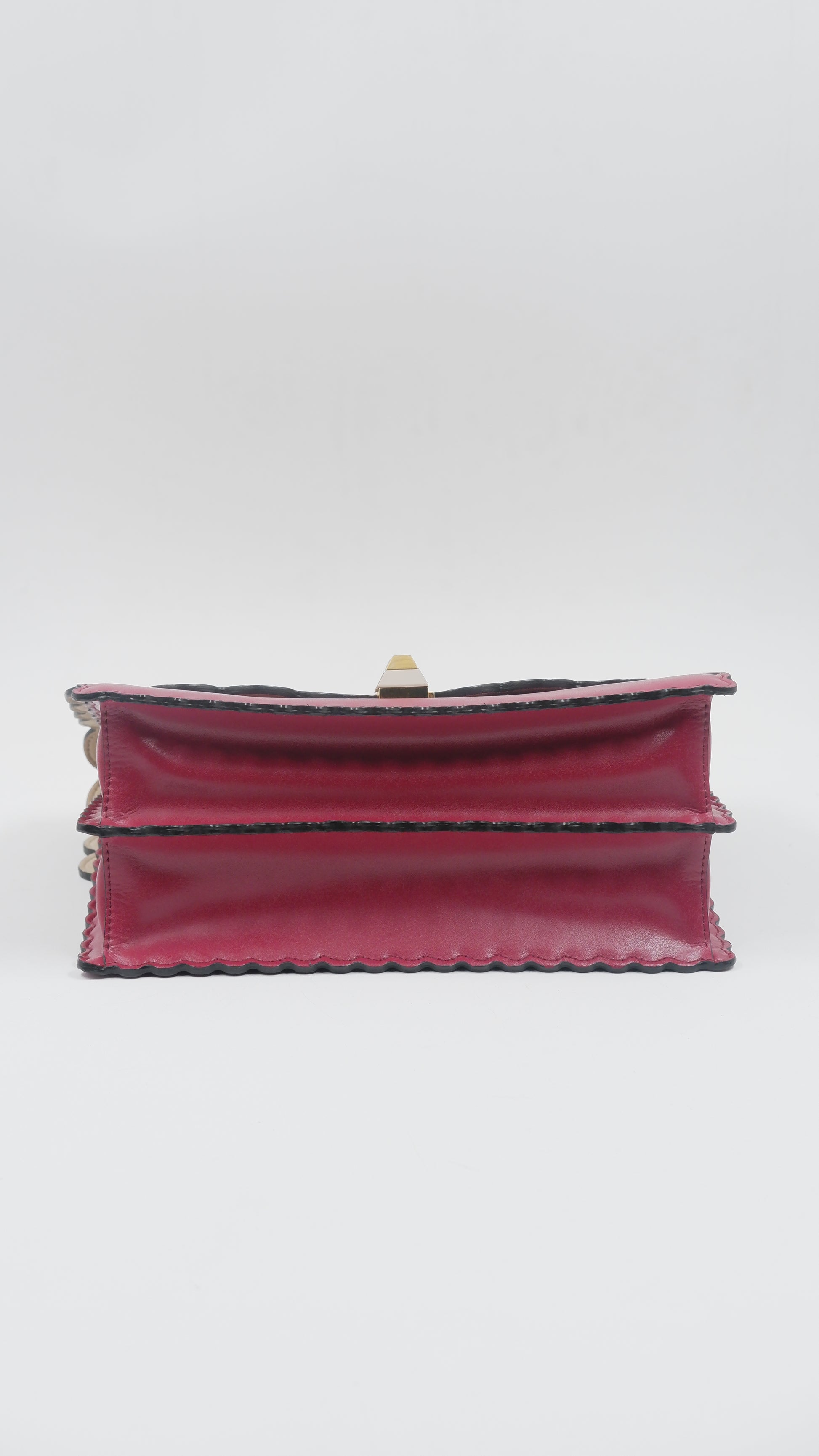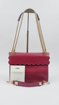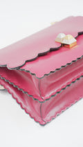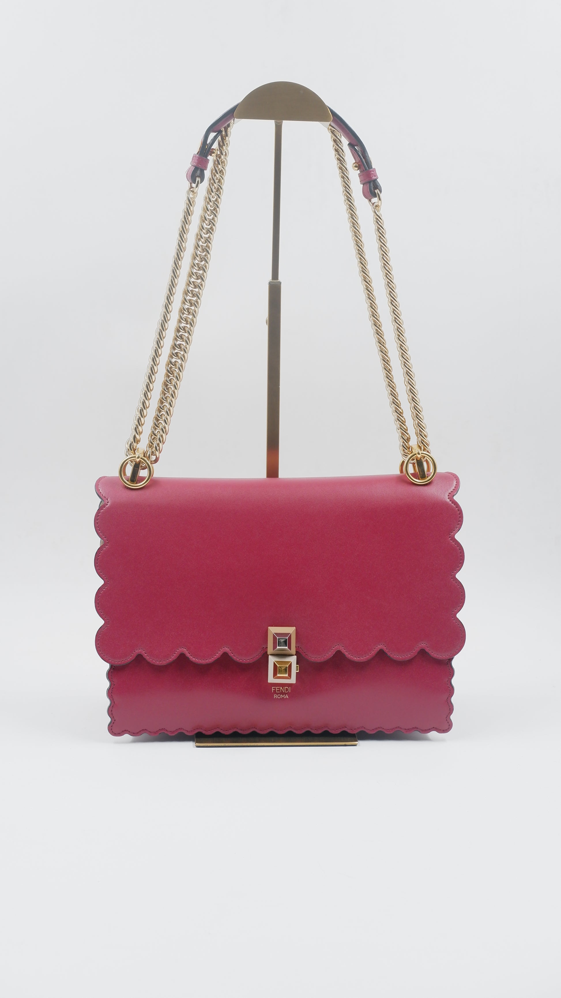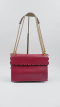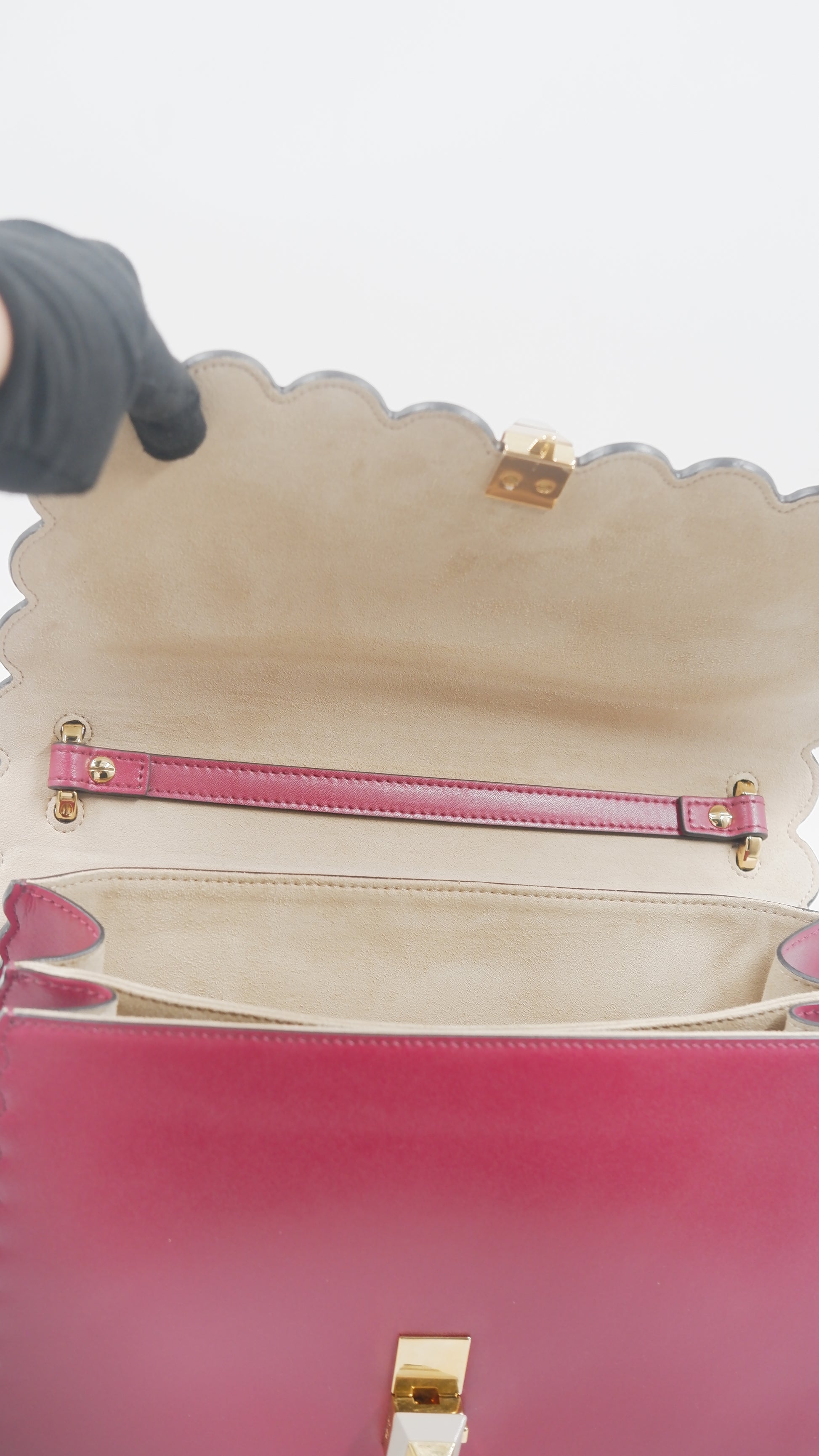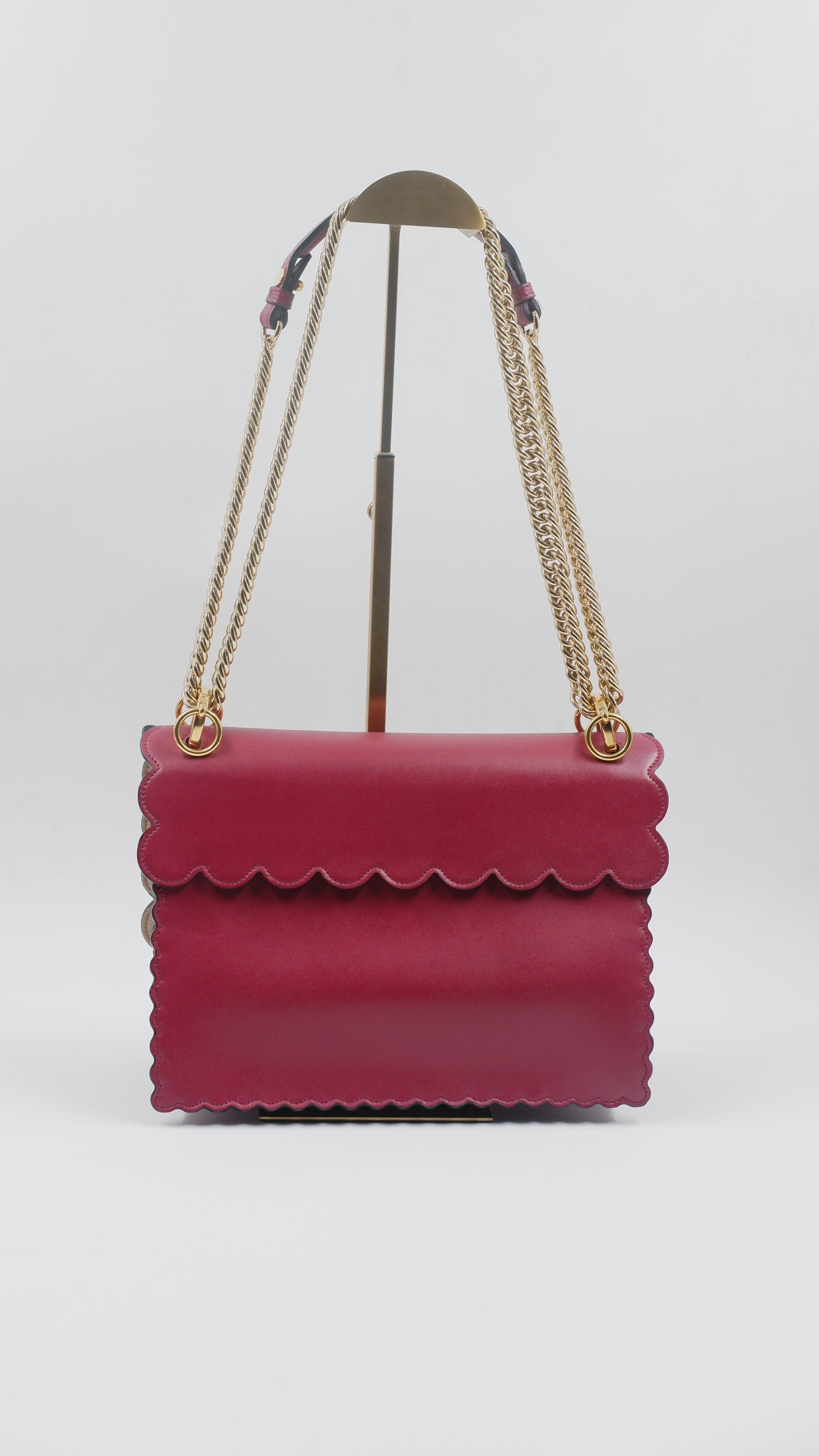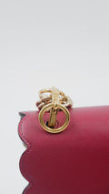 The Kan I Scalloped Shoulder Bag exemplifies refined craftsmanship with its exquisite calfskin leather sourced from Italy, offering a luxurious and durable texture. Finished in a striking red hue complemented by gleaming gold hardware, this bag effortlessly elevates any ensemble. Its compact silhouette measures 9.5 inches long, 4.3 inches wide, and 7.5 inches high, making it perfect for carrying essentials while maintaining a polished look. Meticulously preserved in excellent condition both inside and out, it includes a card and a matching handle strap for versatile styling. This meticulously crafted bag is the perfect accessory for those who value elegance and everyday sophistication.