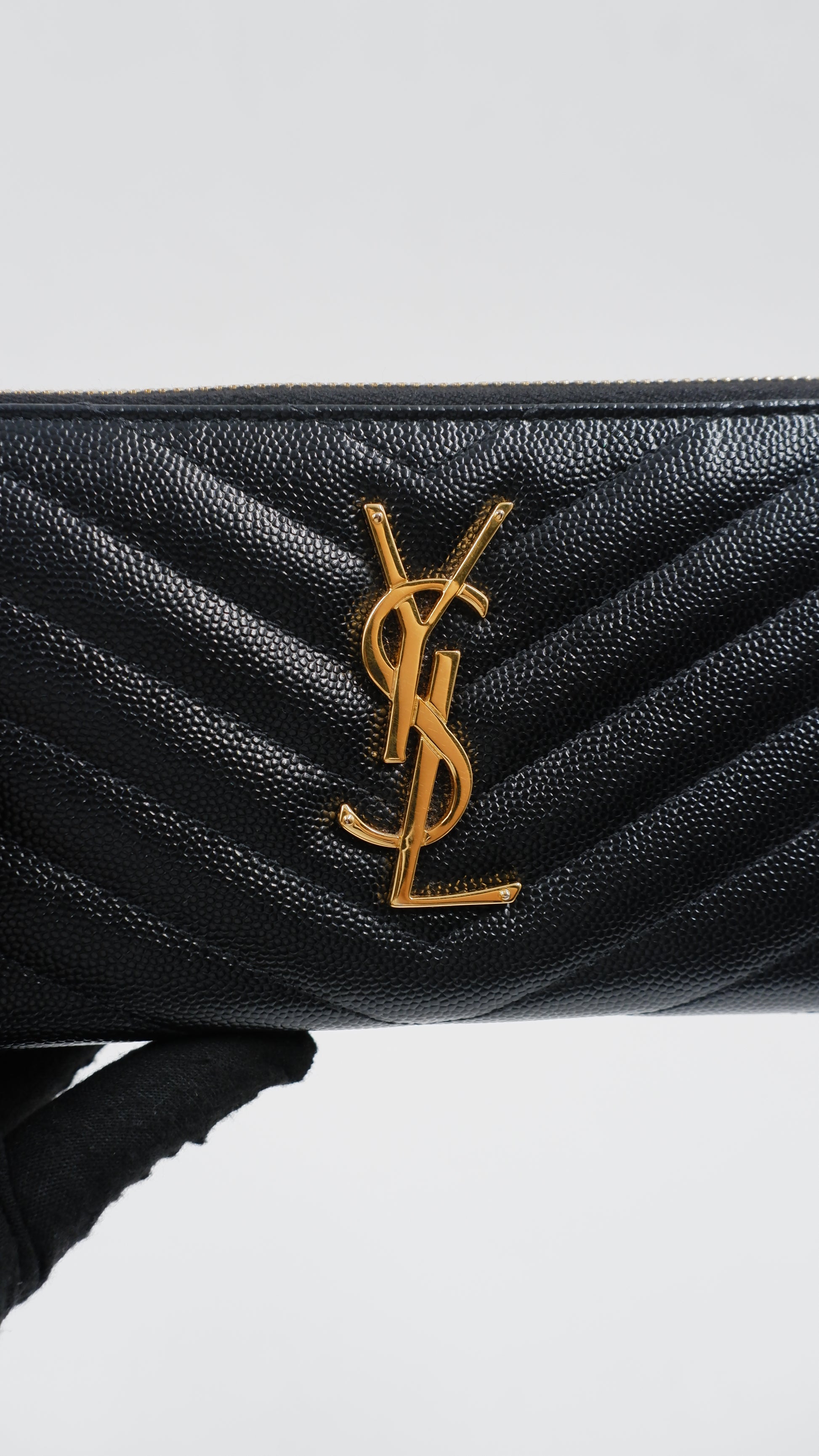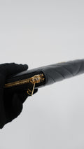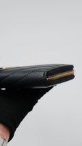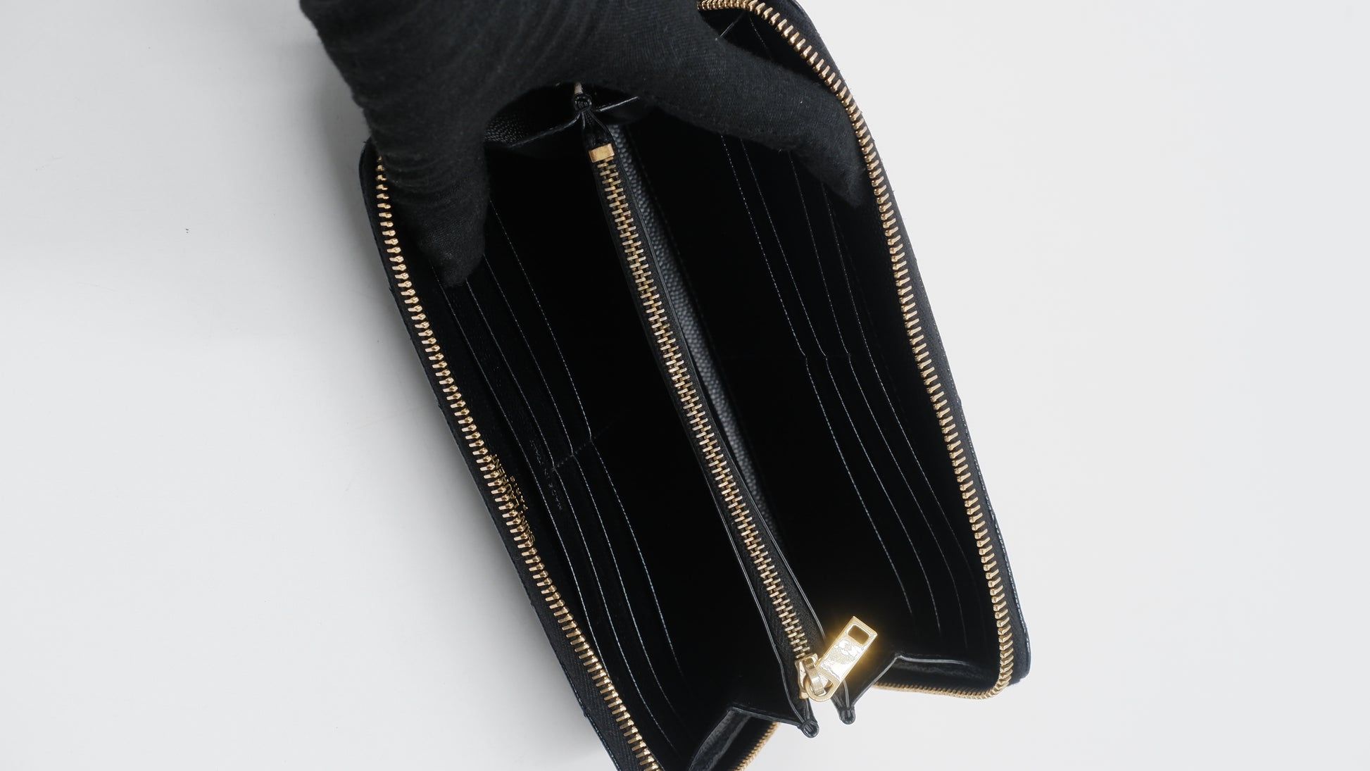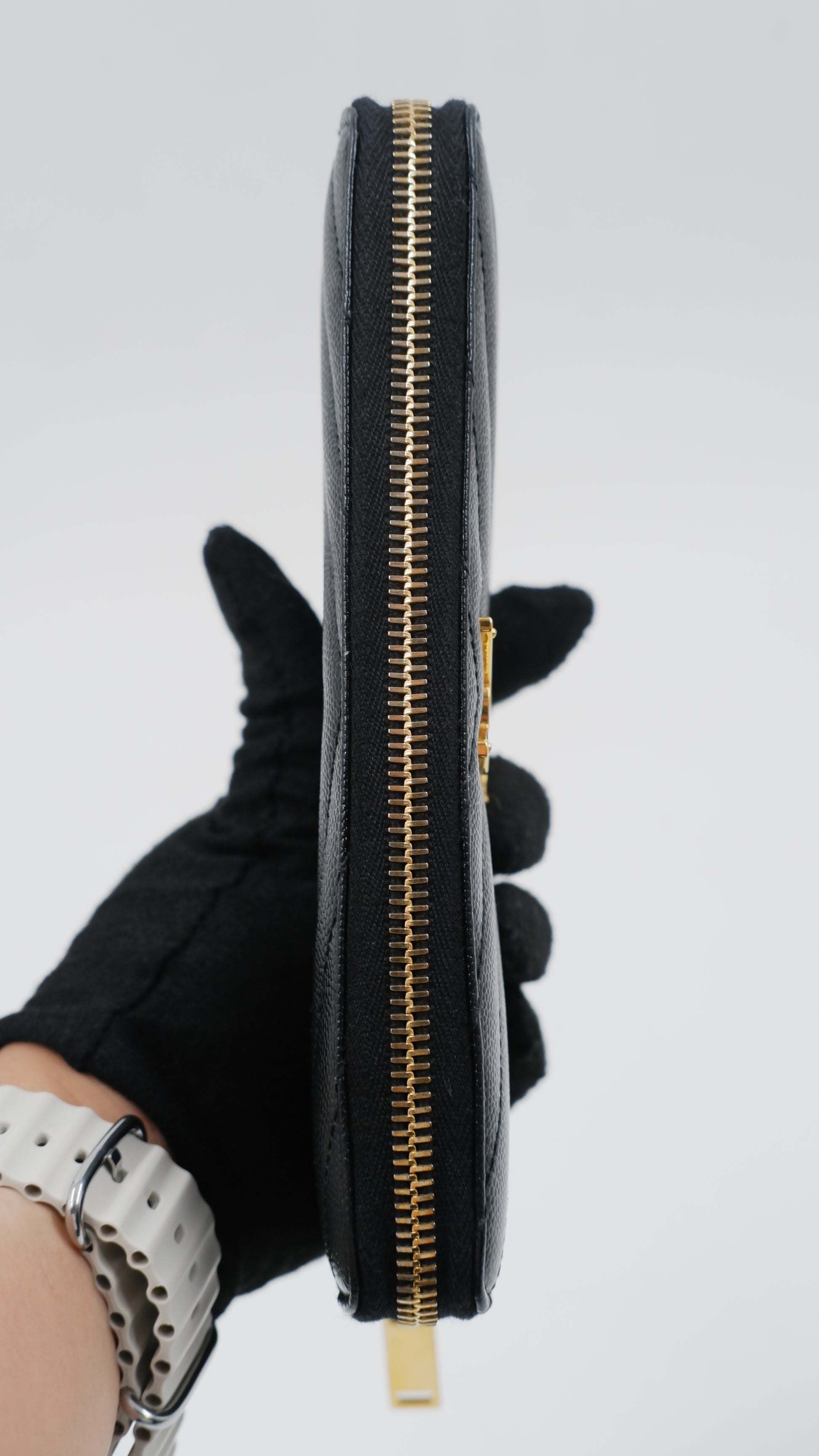 Experience timeless elegance with this Long Zippy Wallet, crafted from luxurious caviar leather in a deep black hue. Made in Italy with meticulous attention to detail, it boasts gold hardware that adds a refined touch. The wallet is in mint condition inside and out, rated A+ for quality assurance. Its spacious design measures 7.5 inches long by 3.5 inches high, offering ample room for cards and essentials. Complete with original dust bag and box, this wallet is the perfect blend of functionality and sophistication for the discerning individual.