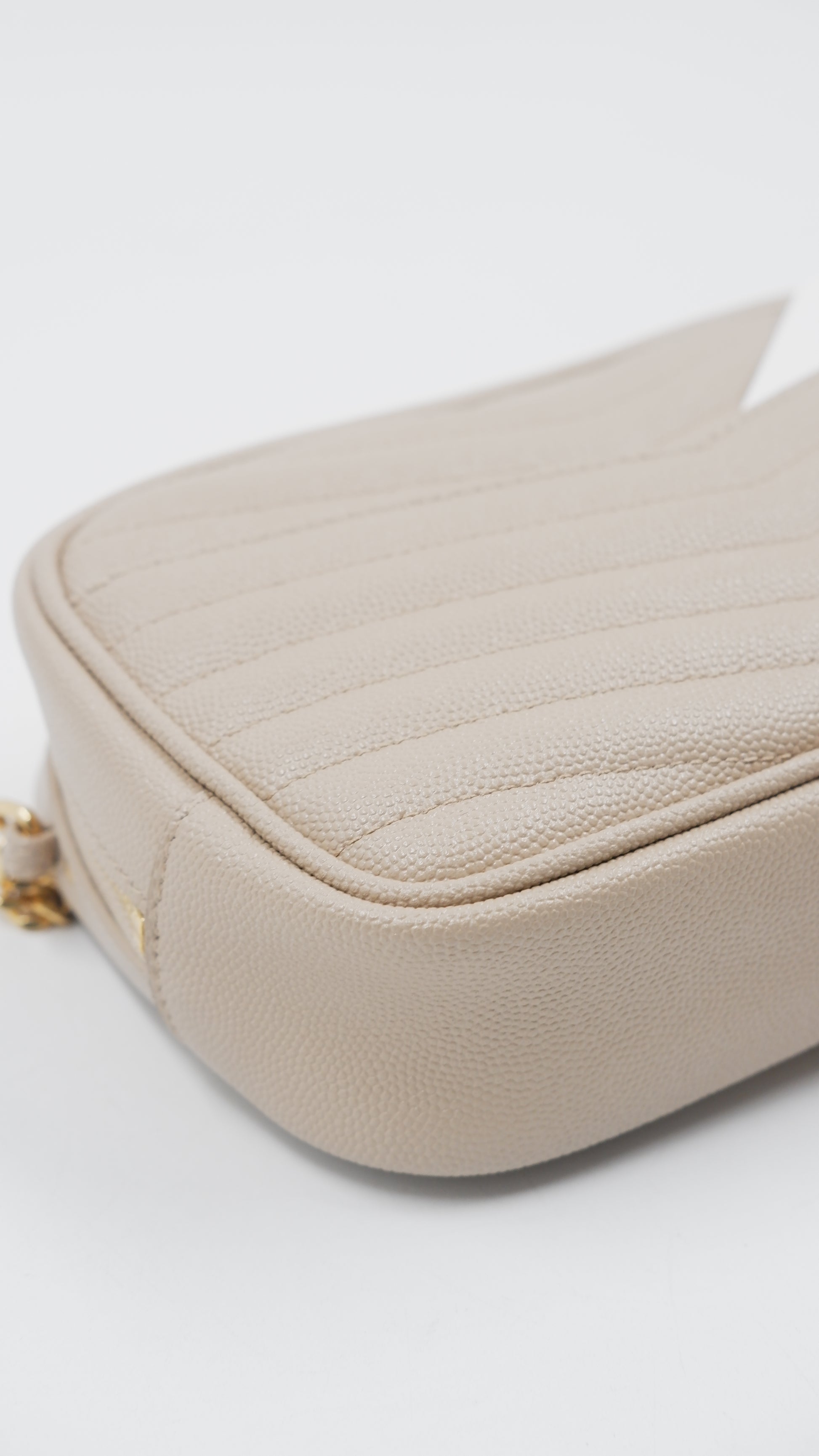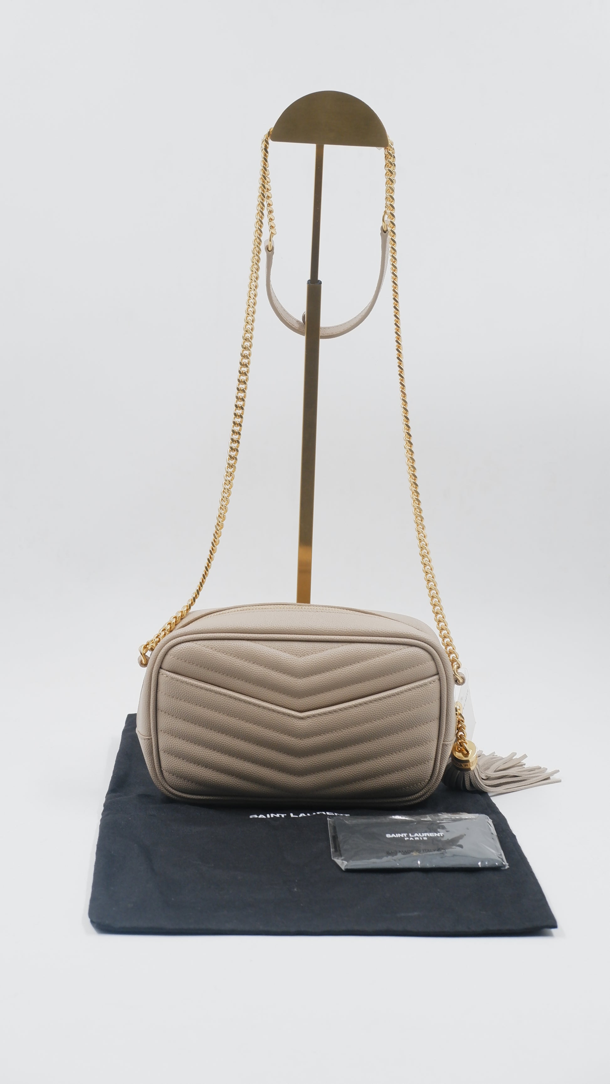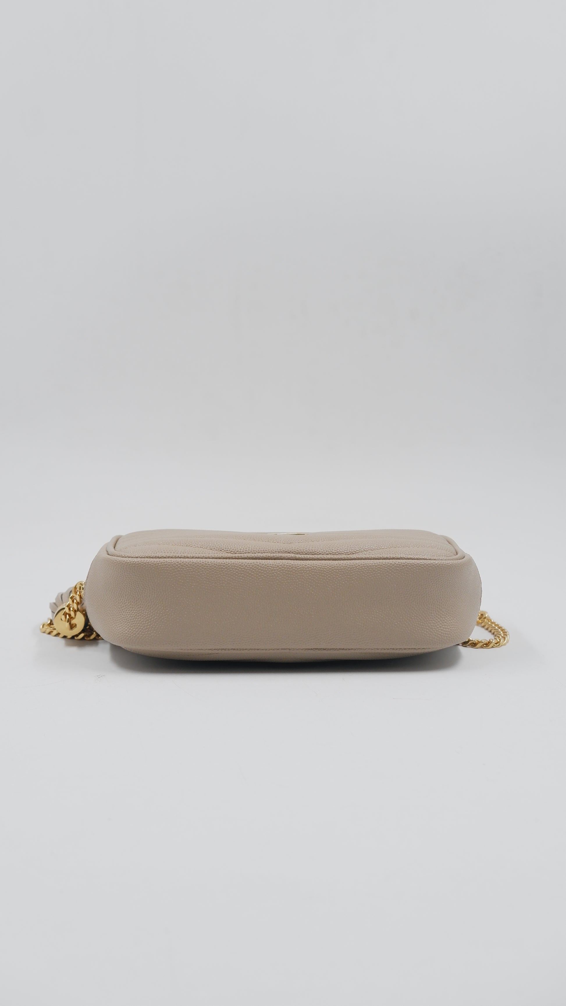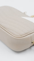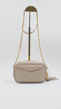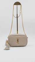 The Lou Mini Quilted Leather Crossbody Bag represents timeless Italian craftsmanship at its finest. This A+ ranked piece showcases pristine quilted leather in a sophisticated beige tone, maintaining mint condition throughout both exterior and interior. Measuring a perfectly proportioned 7L x 1.5W x 4.4H inches, this compact crossbody effortlessly transitions from day to evening occasions. The gleaming gold-tone hardware adds an elegant finishing touch, while the supple quilted leather construction promises durability and refined aesthetics. Authenticity is assured with included authentication cards and the original dustbag for safekeeping. An investment piece that embodies European luxury and understated elegance for the discerning collector.