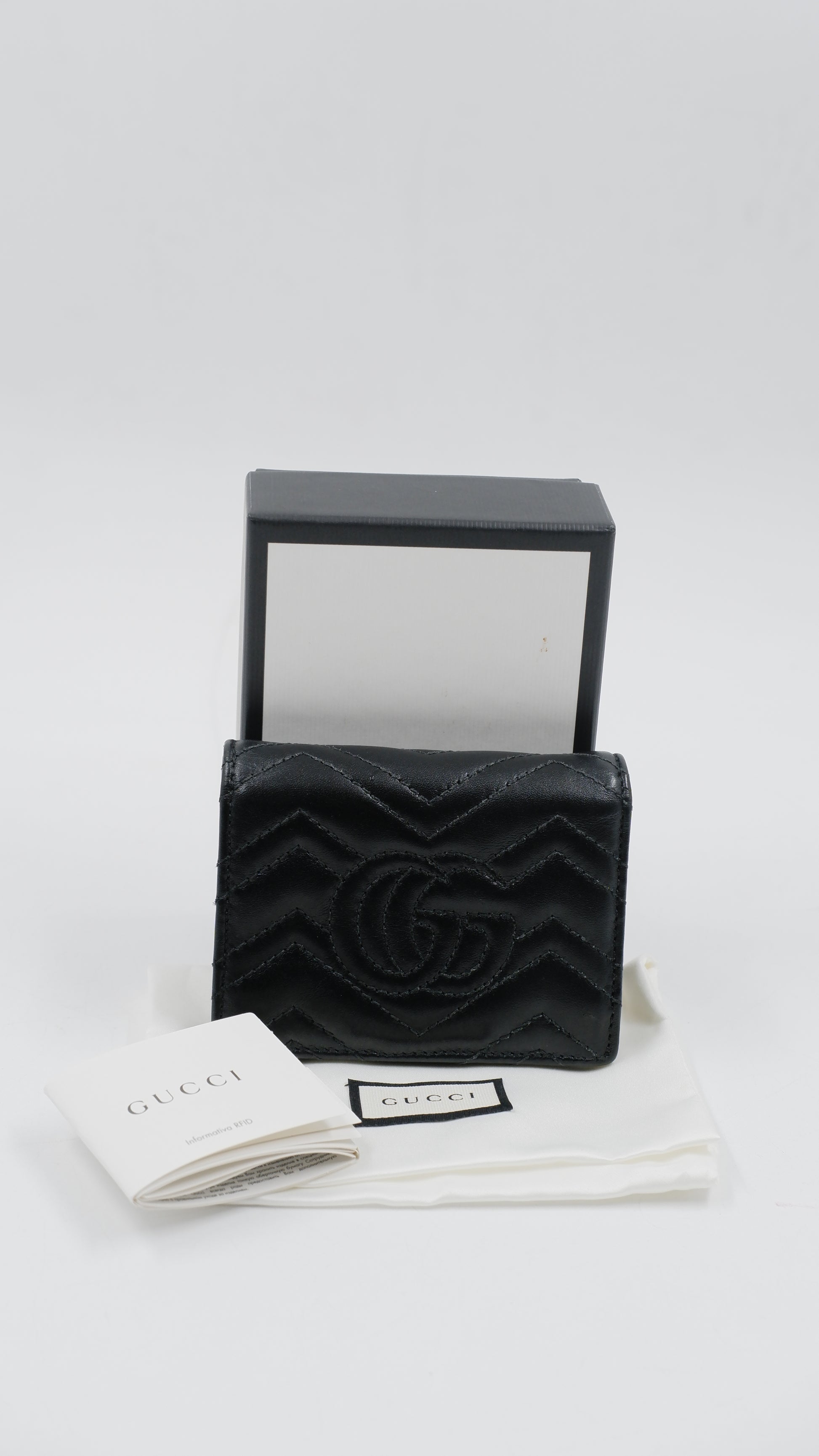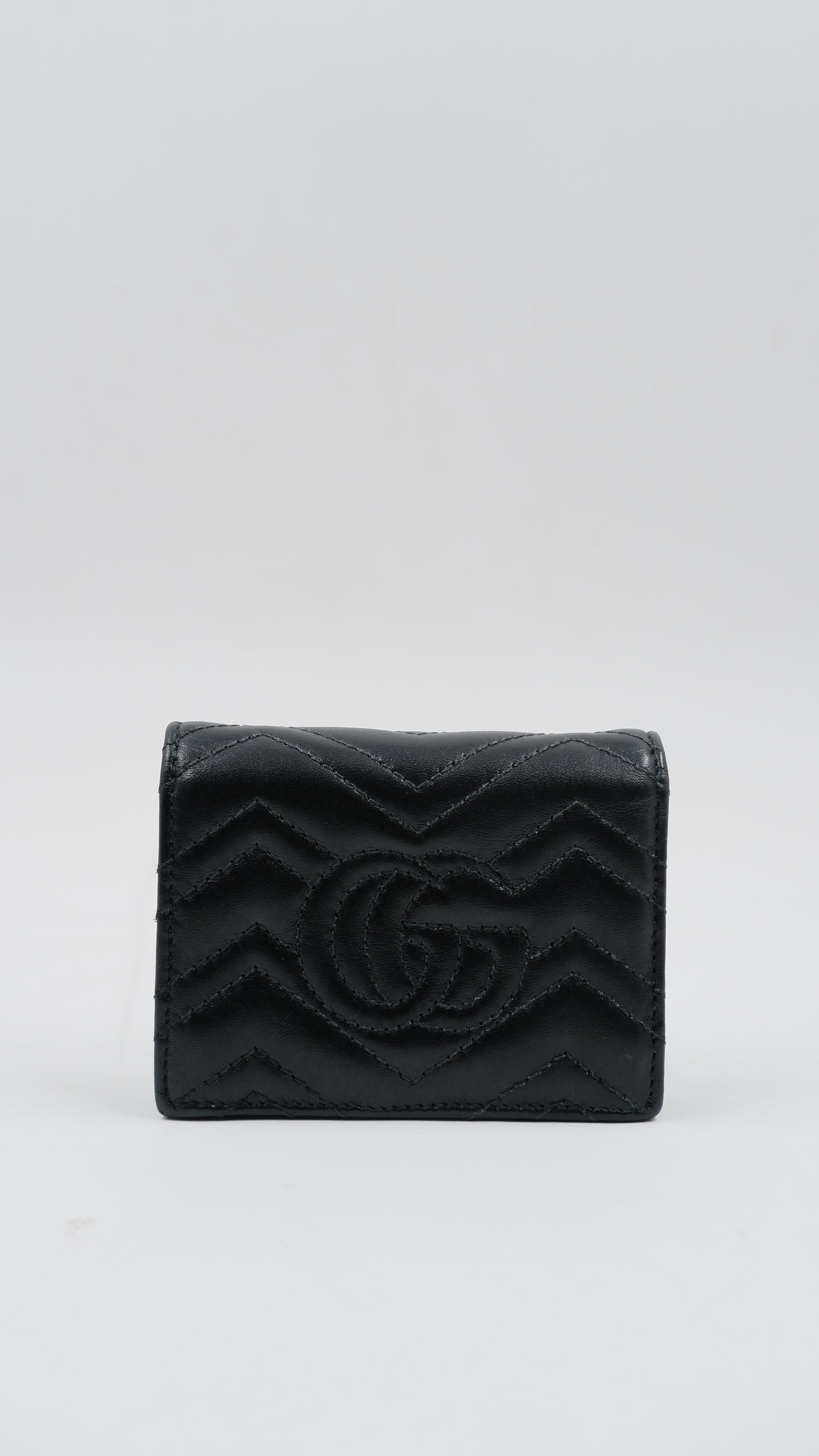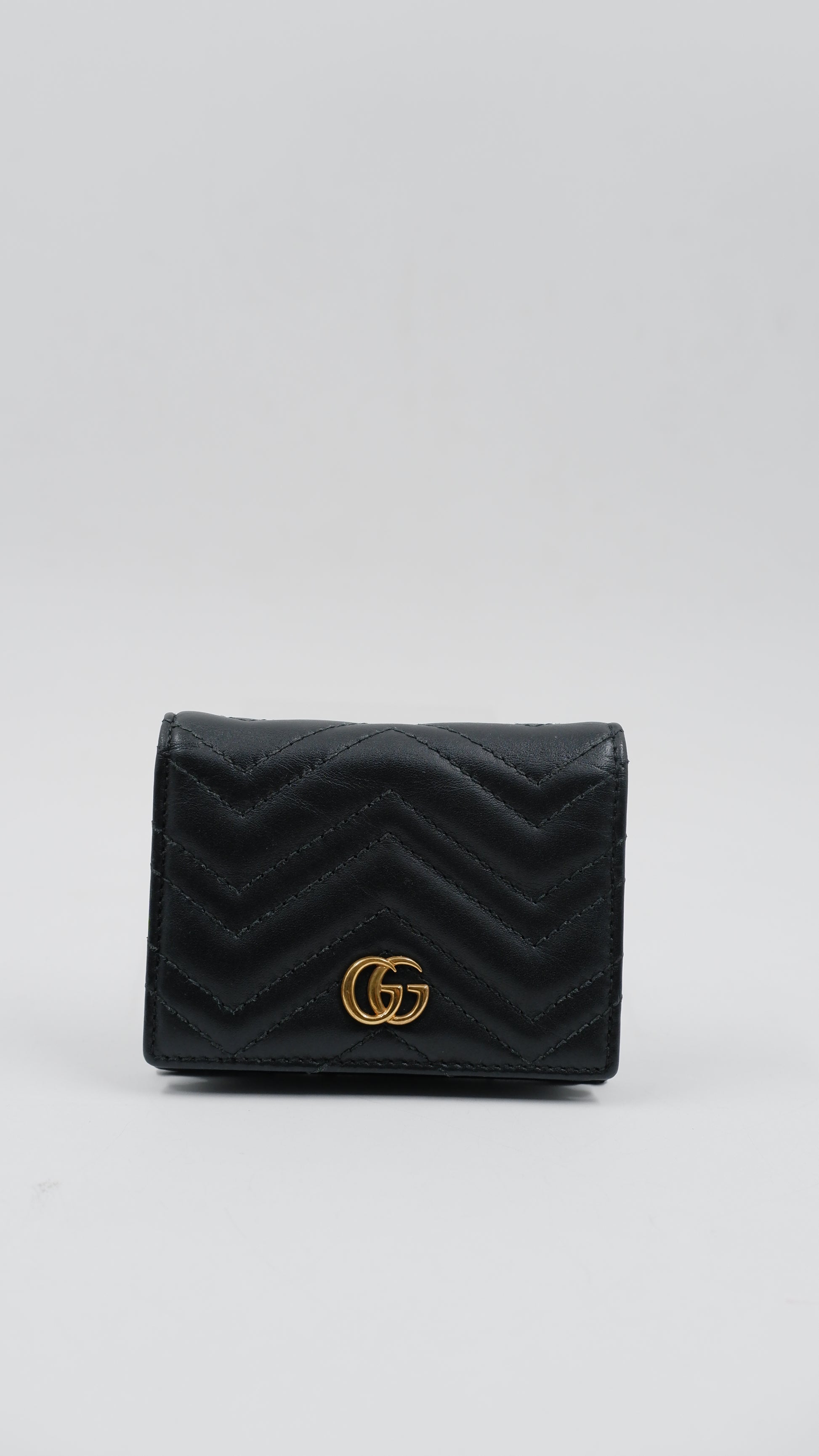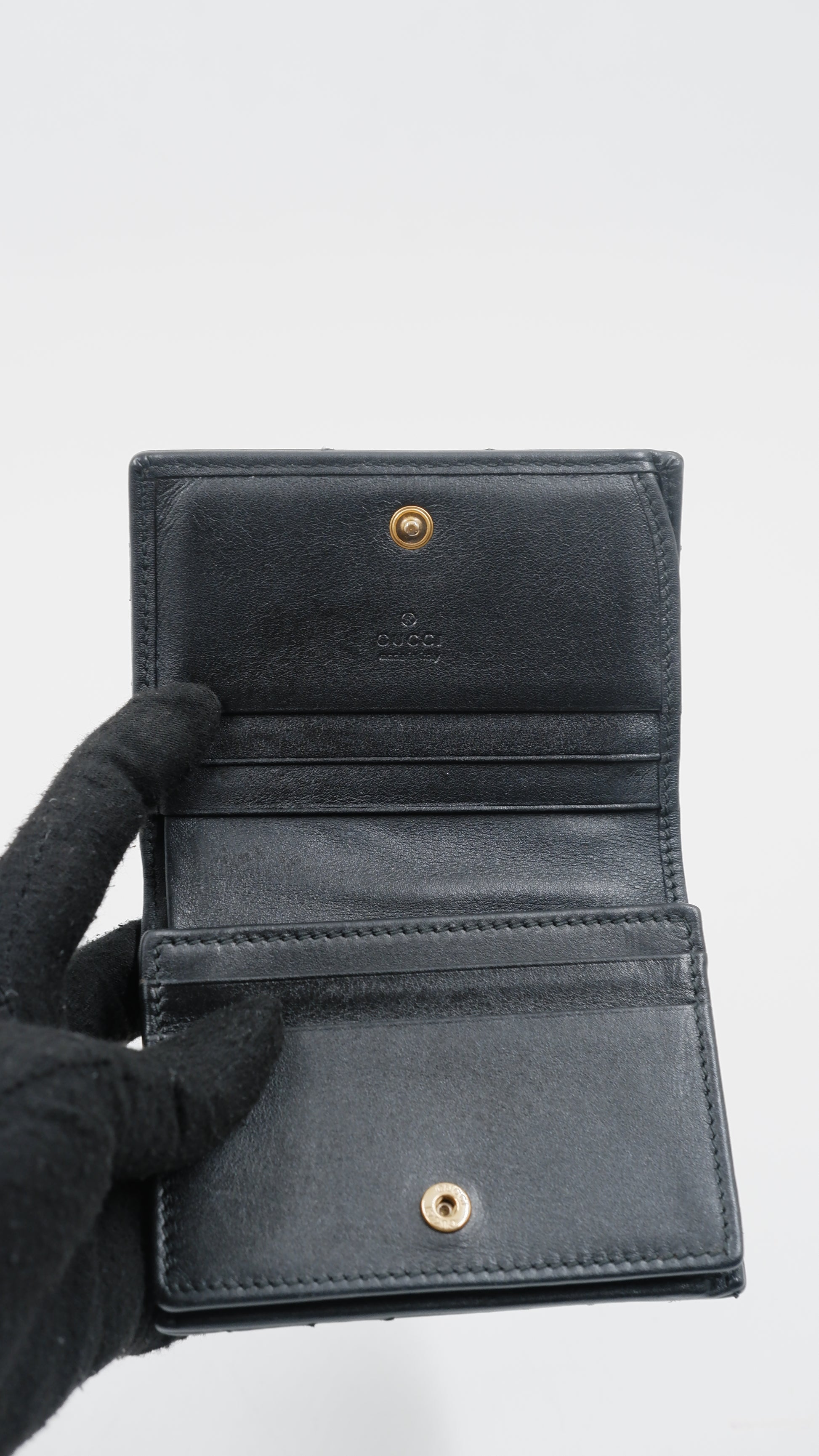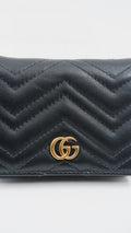 The Marmont Wallet is a refined accessory crafted from premium calfskin leather, showcasing exceptional quality and elegance. Made in Italy, this black wallet features gleaming gold hardware that adds a touch of sophistication to its classic design. Measuring 4.2 inches in length and 3.2 inches in height, it offers a compact yet practical size for everyday use. Its exterior and interior are both in excellent condition, reflecting meticulous care and durability. Complete with original cards, dust bag, and box, this A-rank wallet combines timeless style with functionality, making it an indispensable addition to any luxury collection.