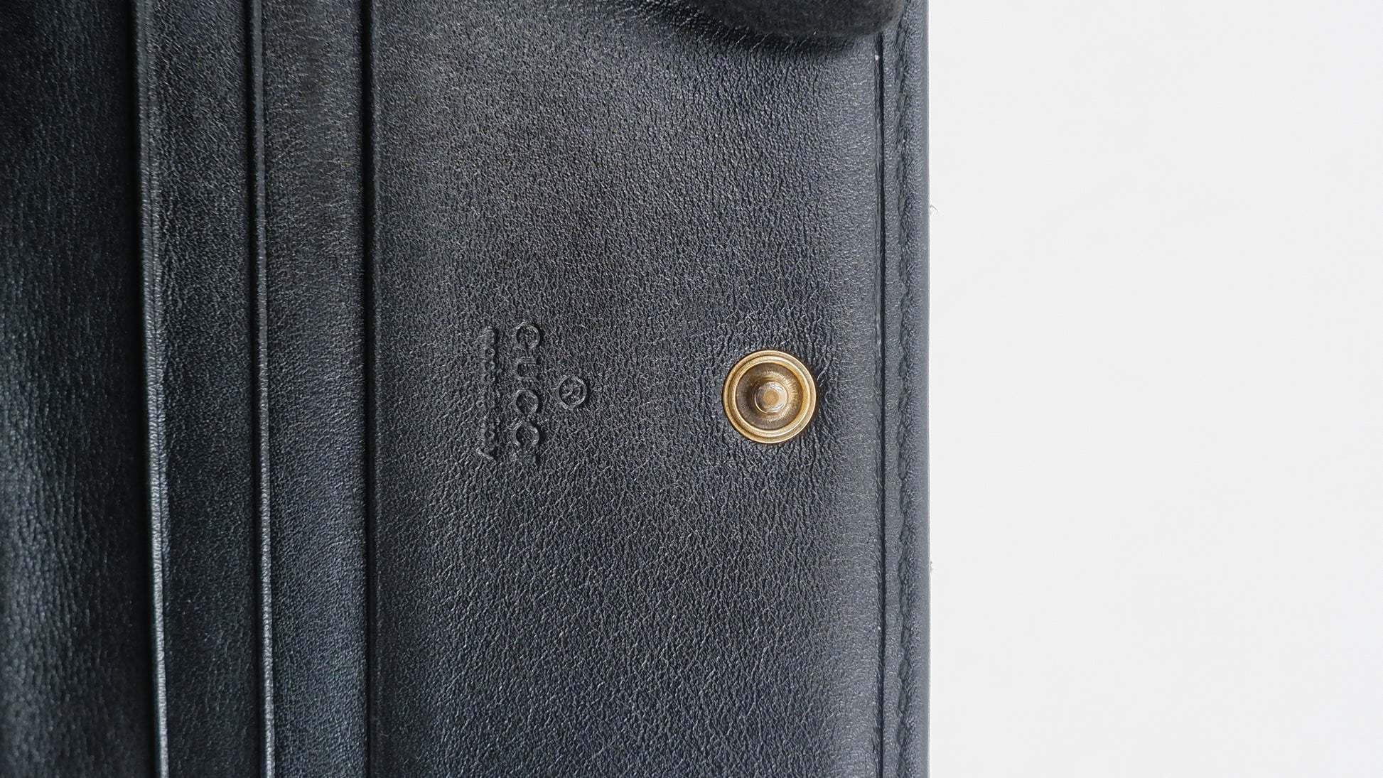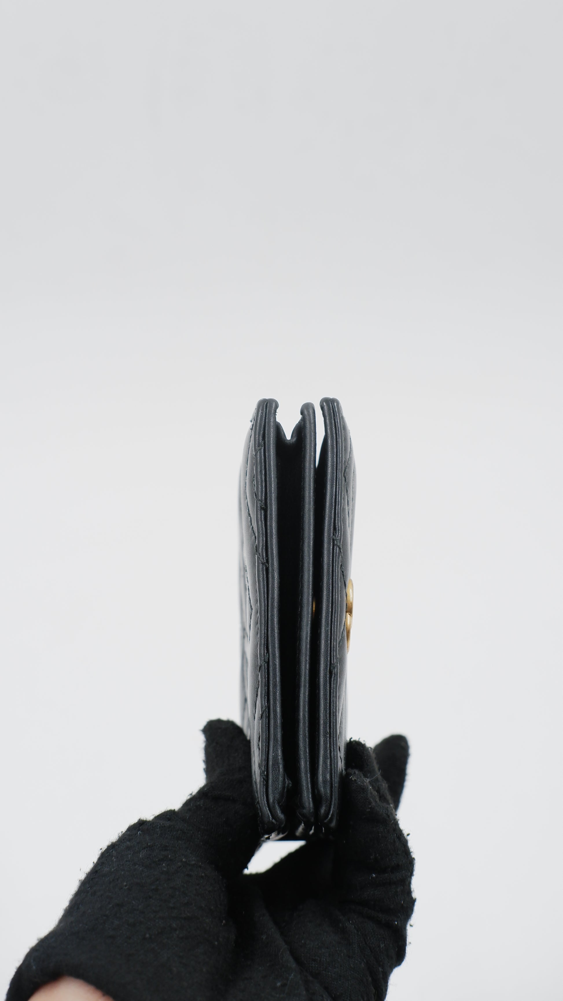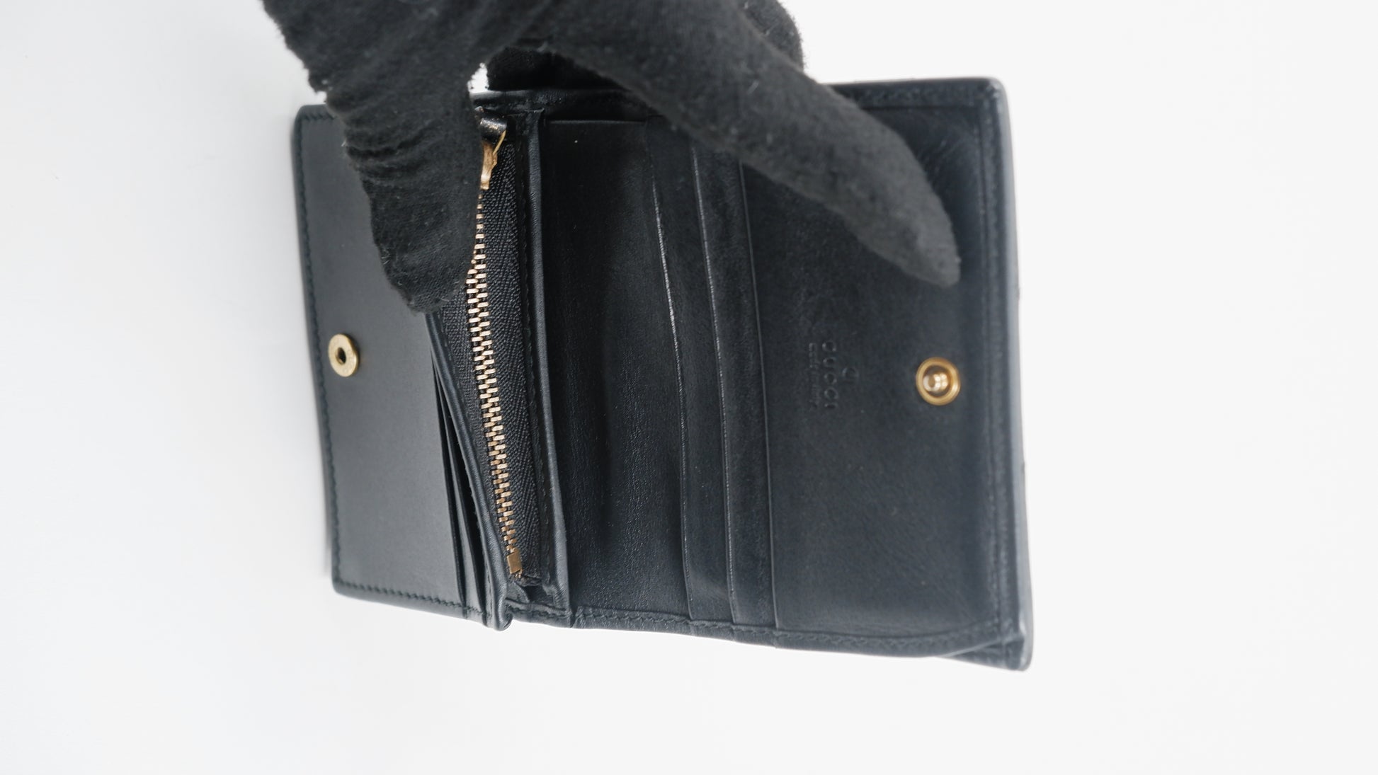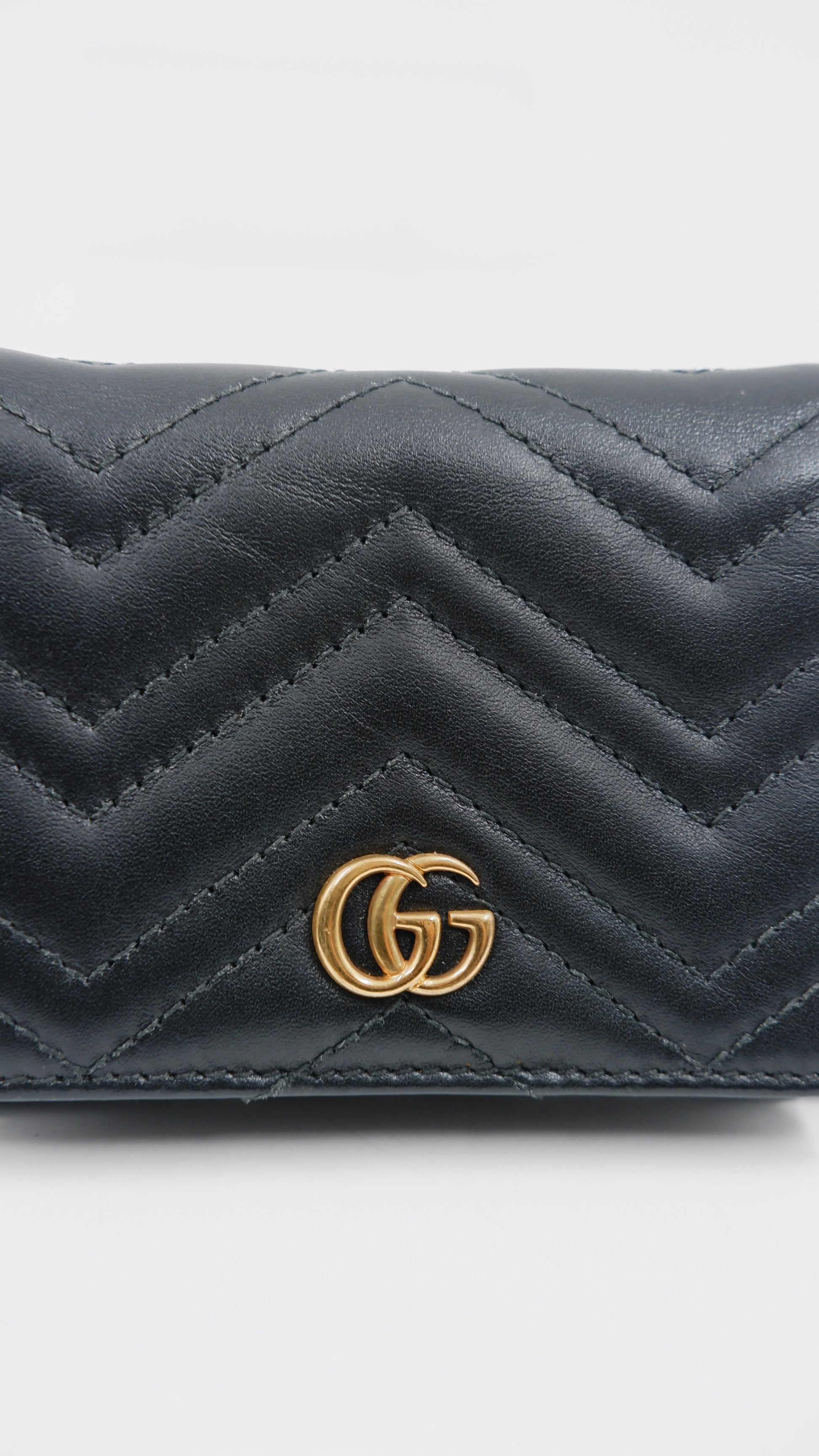 The Marmont Wallet is a refined accessory crafted from premium calfskin leather, showcasing exceptional quality and elegance. Made in Italy, this black wallet features gleaming gold hardware that adds a touch of sophistication to its classic design. Measuring 4.2 inches in length and 3.2 inches in height, it offers a compact yet practical size for everyday use. Its exterior and interior are both in excellent condition, reflecting meticulous care and durability. Complete with original cards, dust bag, and box, this A-rank wallet combines timeless style with functionality, making it an indispensable addition to any luxury collection.