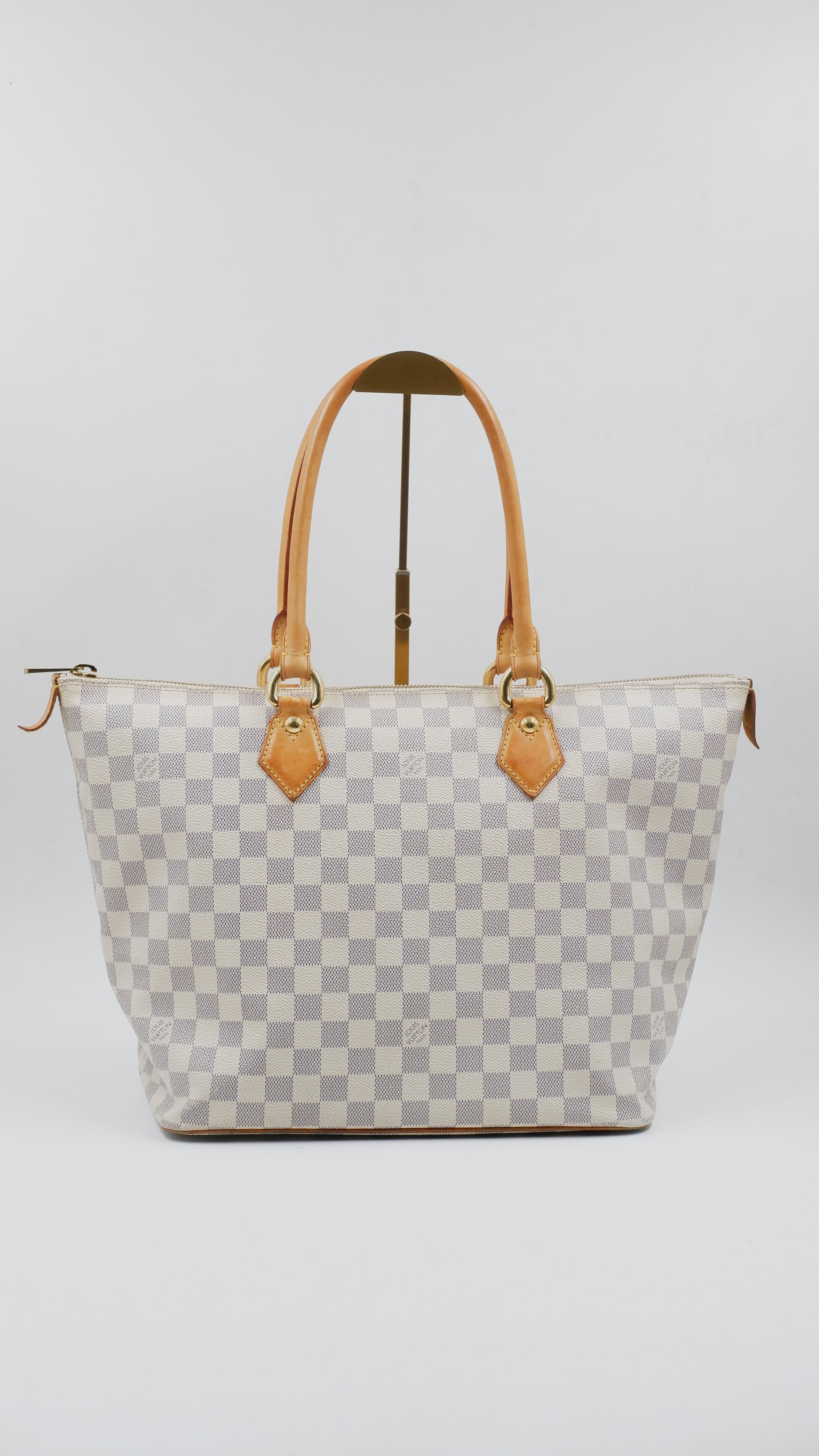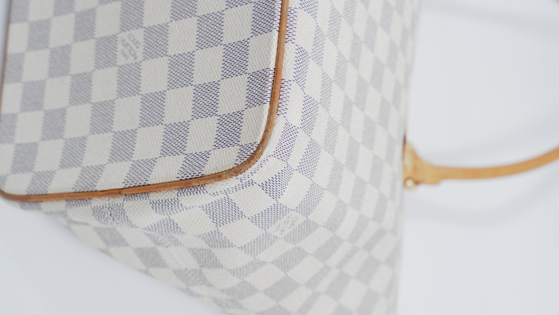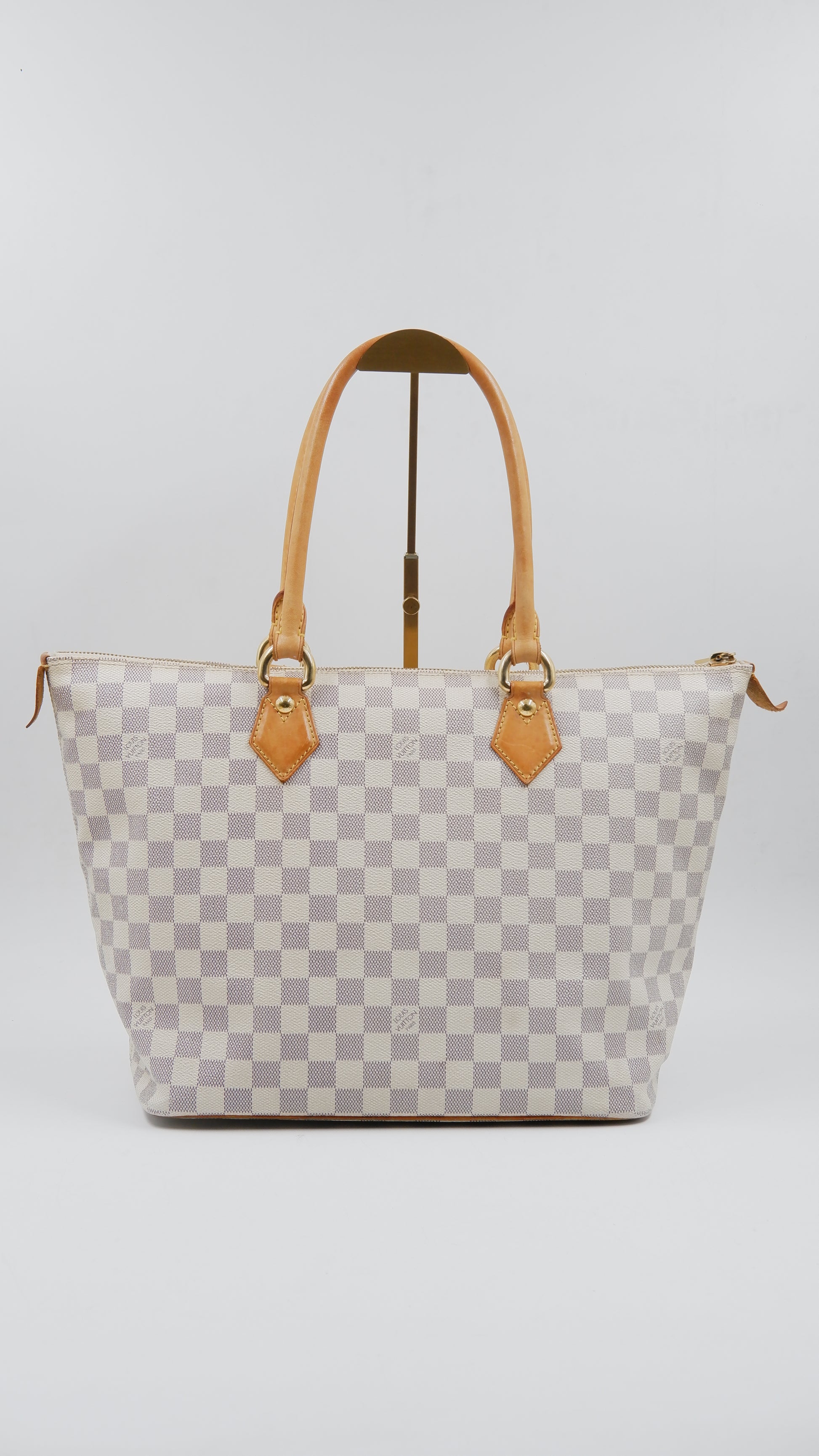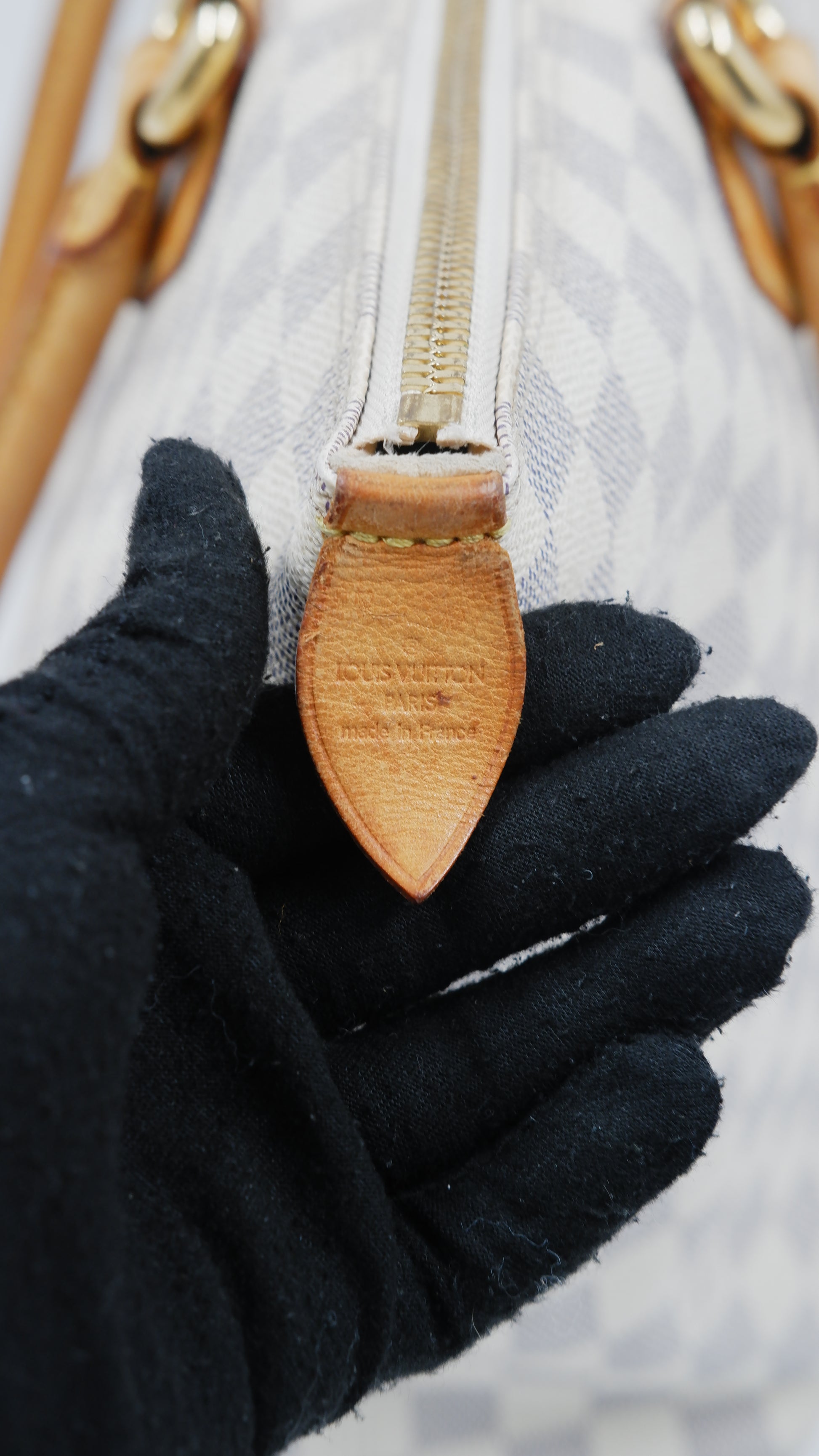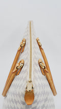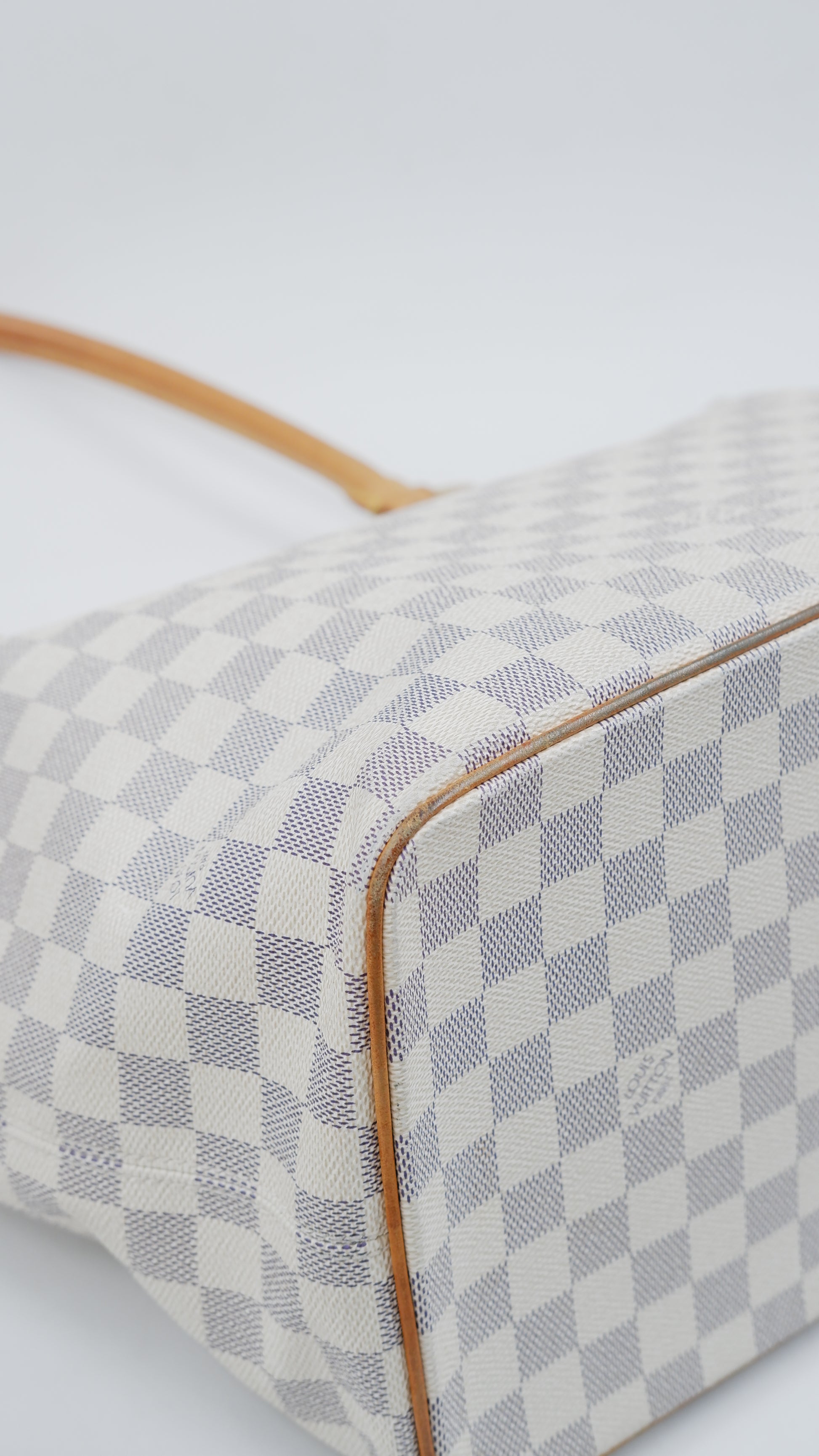 Experience timeless elegance with the Neverfull Zip Closure DE Azure MM, a luxurious leather tote crafted in France. This piece boasts an excellent overall condition, with pristine gray and white leather exterior and flawless interior, reflecting meticulous care and superior craftsmanship. Measuring L12 x W7 x H11 inches, it offers ample space for both daily essentials and sophisticated accessories. The gold hardware adds a refined touch, enhancing its classic aesthetic. Complete with the original dust bag, this tote is a perfect blend of functionality and style, ideal for those who appreciate understated luxury and enduring quality.