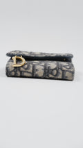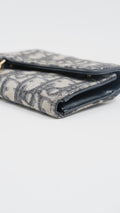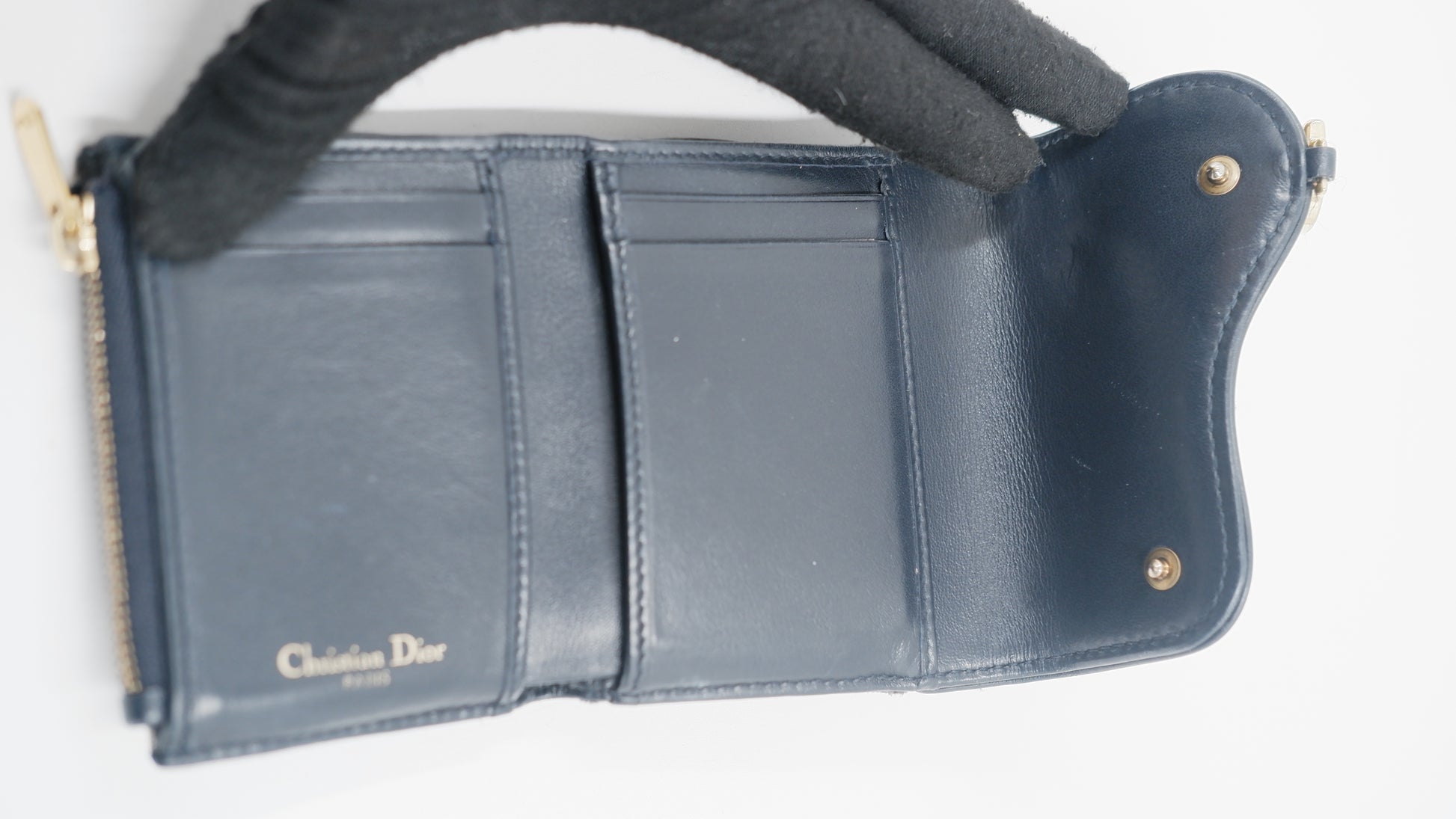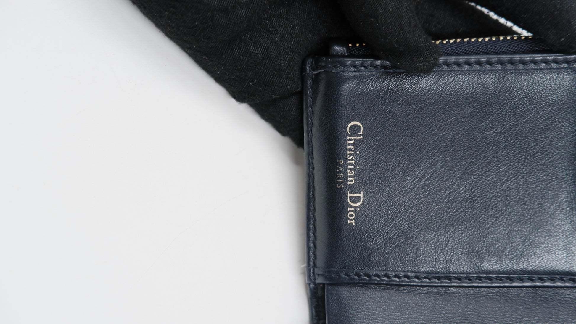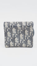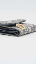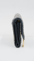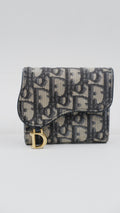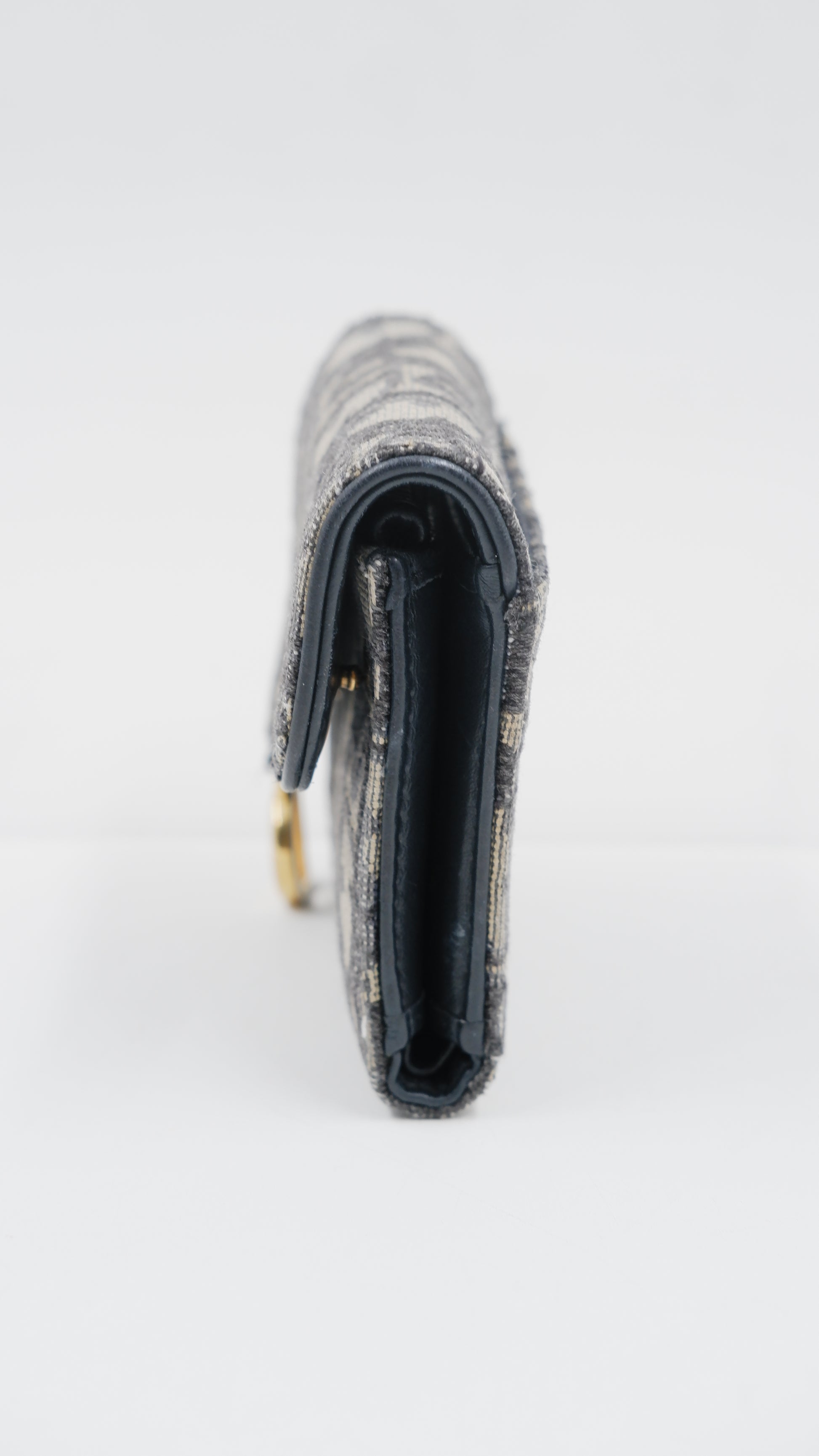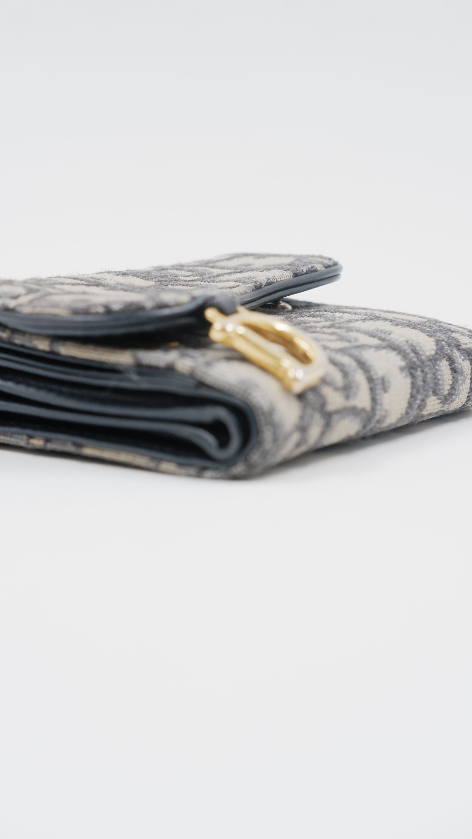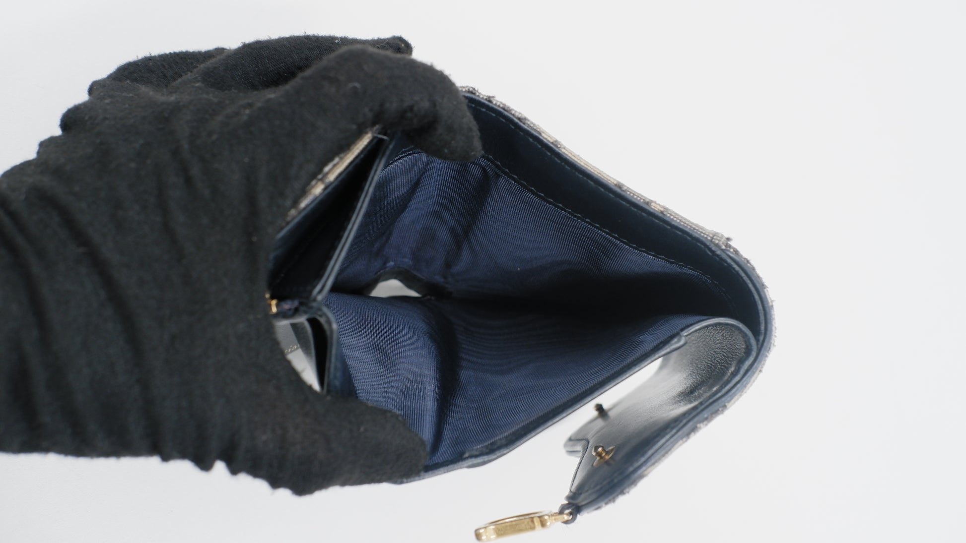 Crafted in France with exquisite gray and dark blue fabric, this oblique compact wallet combines elegance with practicality. Featuring gold hardware that accentuates its refined design, the wallet measures a convenient 4 inches in length and 3.5 inches in height, making it ideal for effortless carrying. Its very good condition, both inside and out, ensures lasting quality and a sophisticated look. Delivered with a protective dust bag, this piece is perfect for those who appreciate timeless French craftsmanship and understated luxury in their everyday accessories.