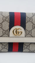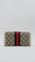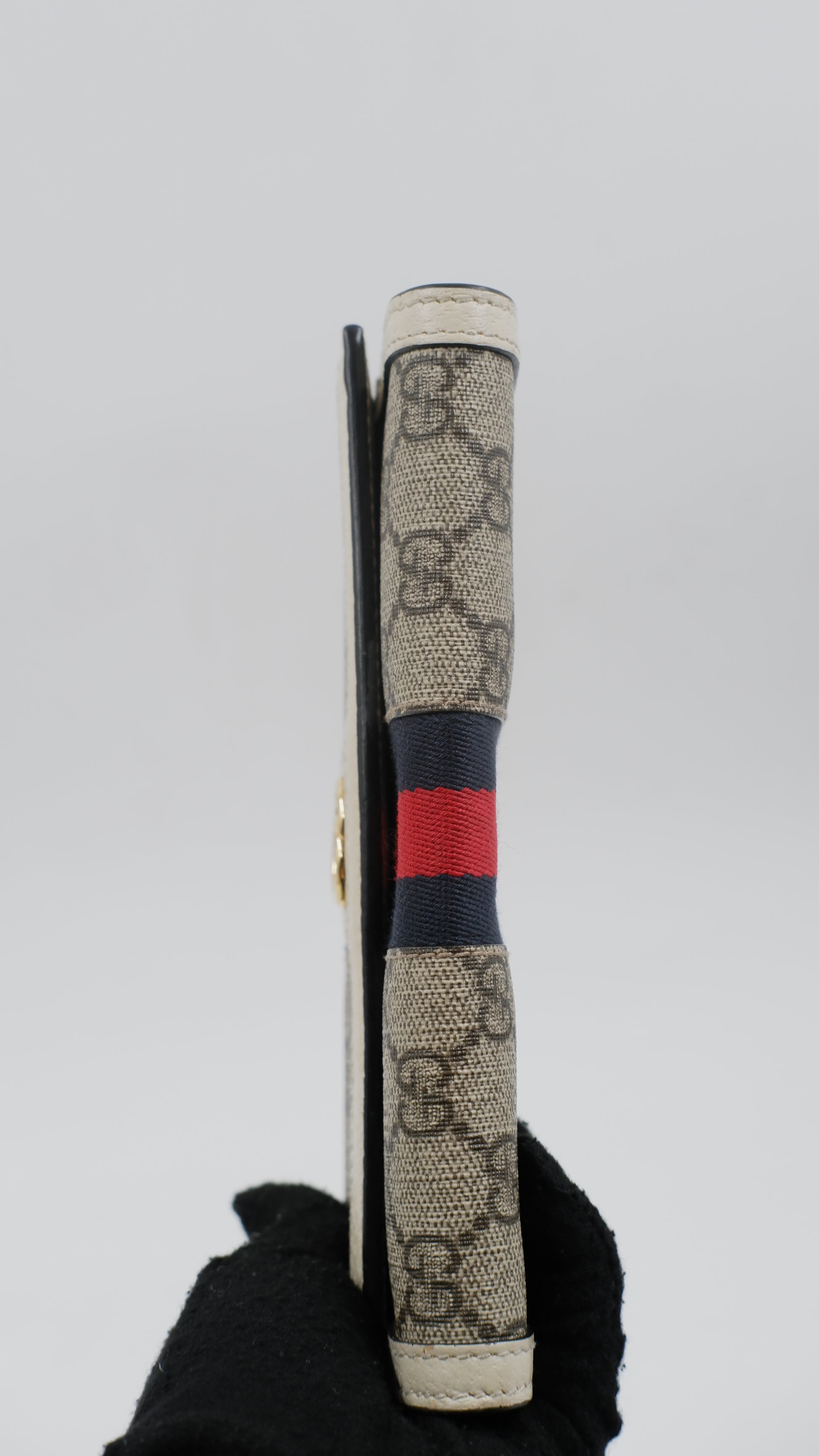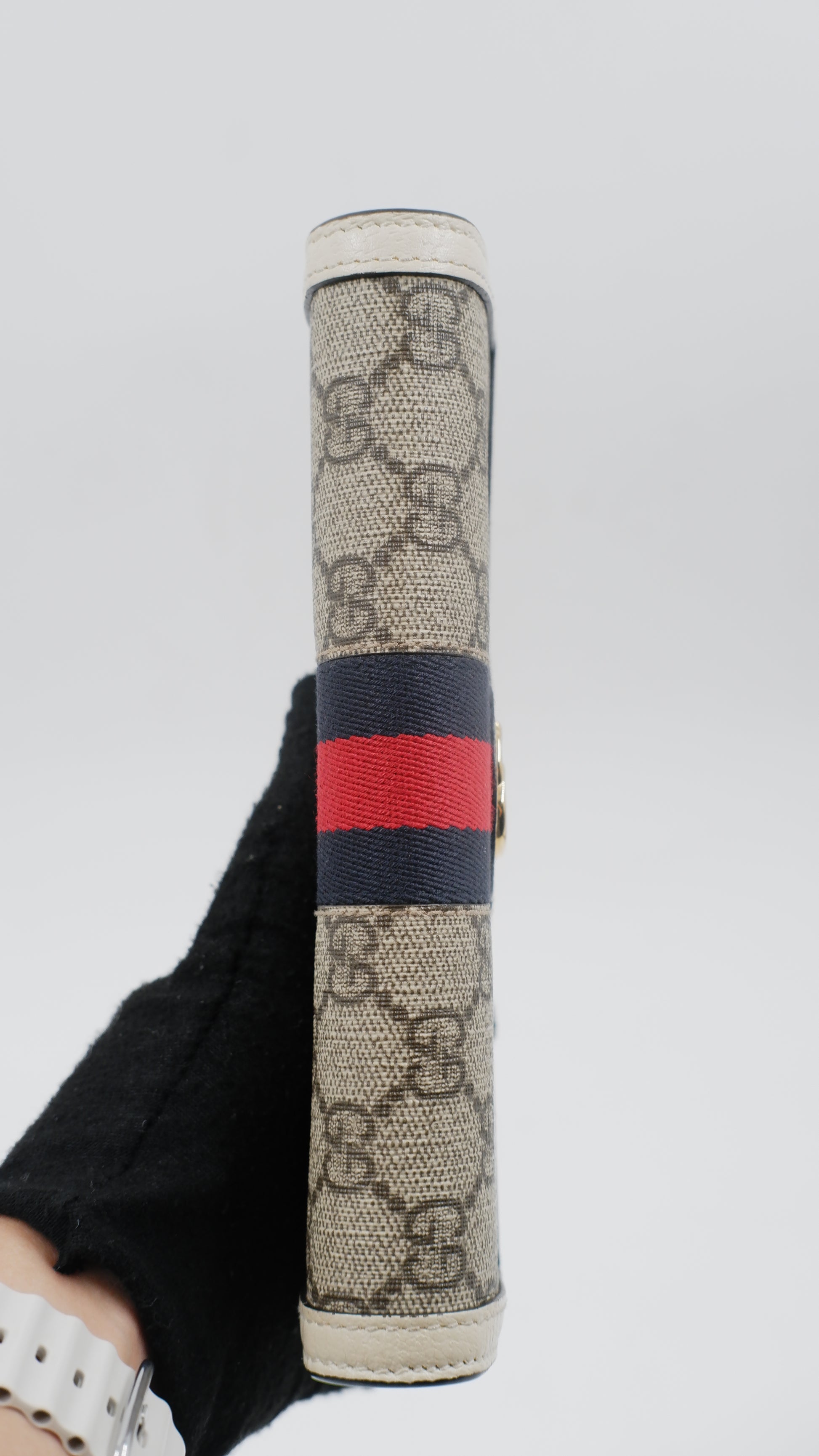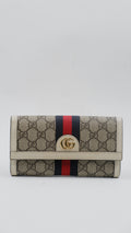 The Ophidia Continental Wallet is a luxurious accessory crafted in Italy from premium GG canvas and leather, showcasing a refined brown and grey exterior paired with elegant white leather lining. This piece is in pristine mint condition, both inside and out, reflecting exceptional care and quality. Measuring 7.5 inches in length and 4 inches in height, it offers ample space for your essentials while maintaining a sleek silhouette. Accented with gold hardware, the wallet exudes timeless sophistication. Included with your purchase is an original dust bag, perfect for protecting this exquisite accessory when not in use. Ideal for those who appreciate classic style combined with functionality.
